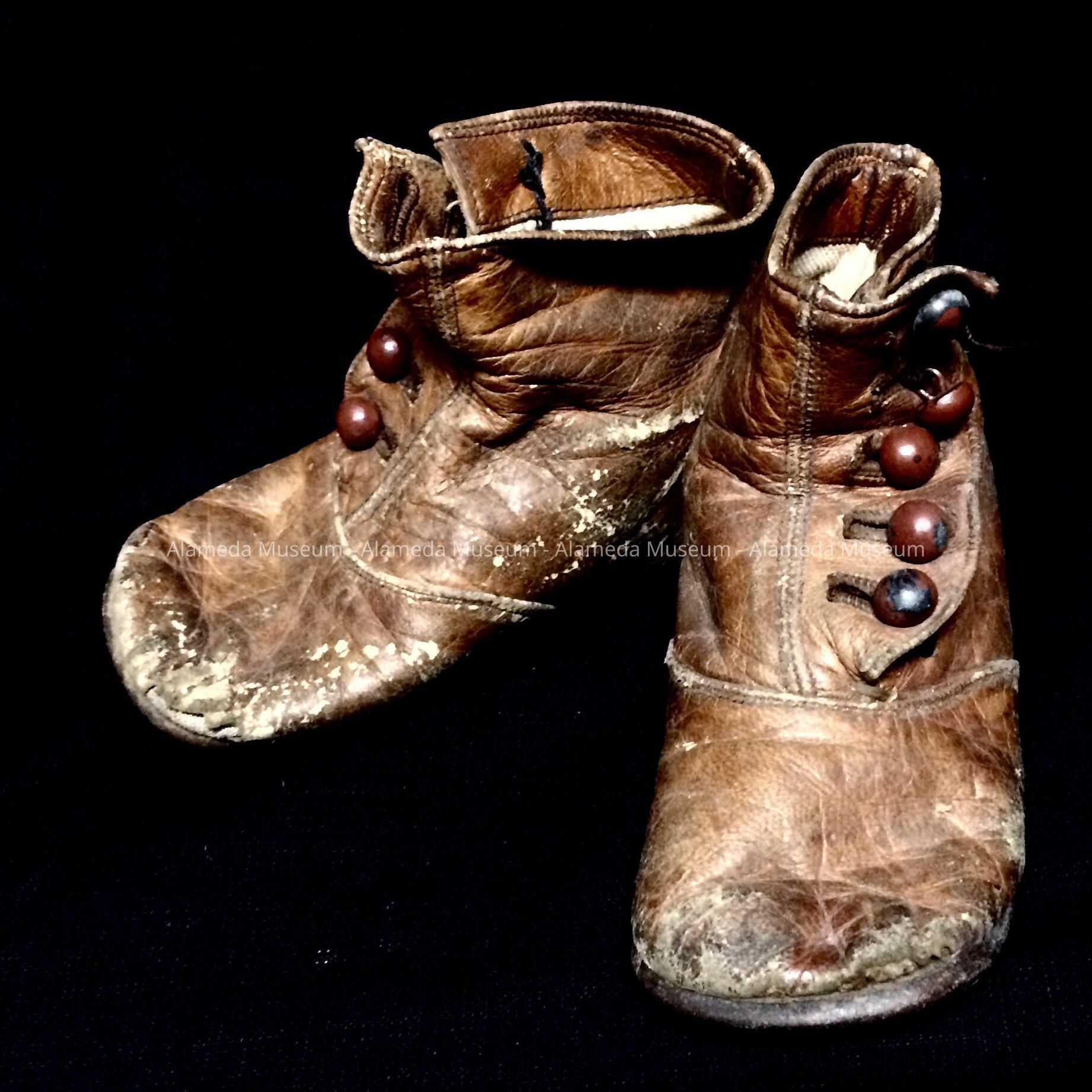 Description: A pair of children’s brown high-button shoes., Each shoe has a row of five brown colored buttons.