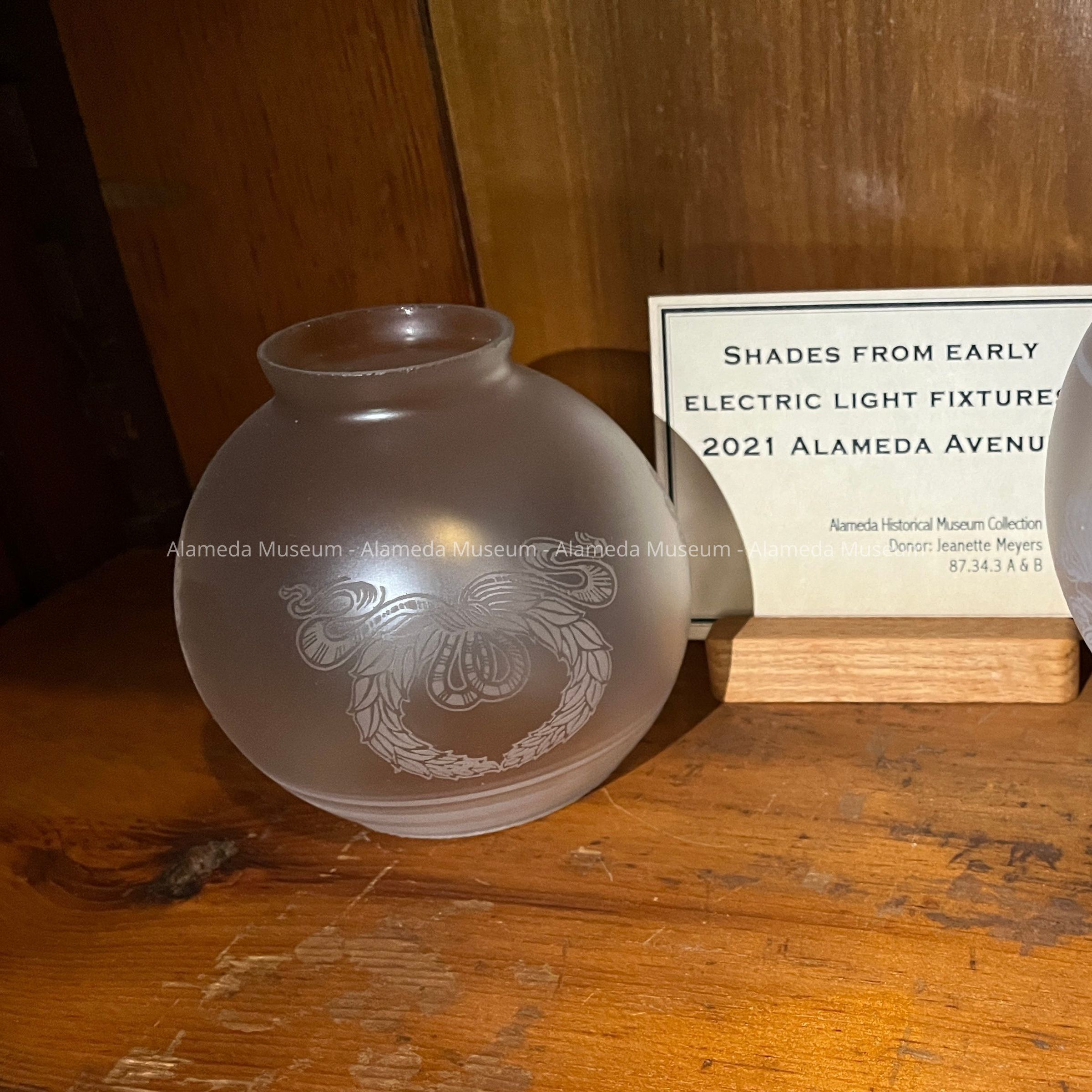 History of Object: Pair of matching glass shades from the original light fixtures (electric) of 2021 Alameda Avenue, the H. H. Meyers home (erected 1897).