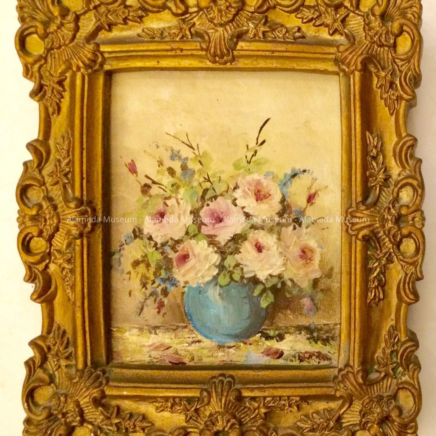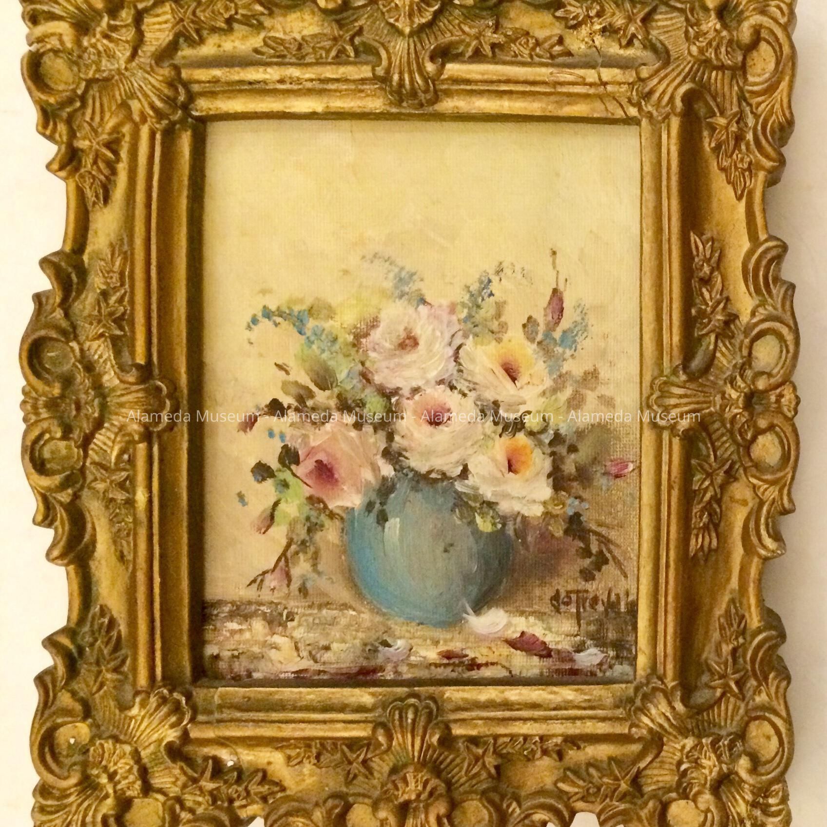PAIR OF STILL LIFE, OIL PAINTINGS, ON ACADEMY BOARD DEPICTING A VASE OF ROSES. PAINTINGS ARE HOUSED IN ELABORATE CAST PLASTER FRAMES, WITH GILT FINISH. REVERSE SIDE OF PAINTINGS HAVE ATTACHED PAPER LABELS STATING, "HAND-PAINTED BY BETTE De TREVILLE." A. SIGNED "De TREVILLE."