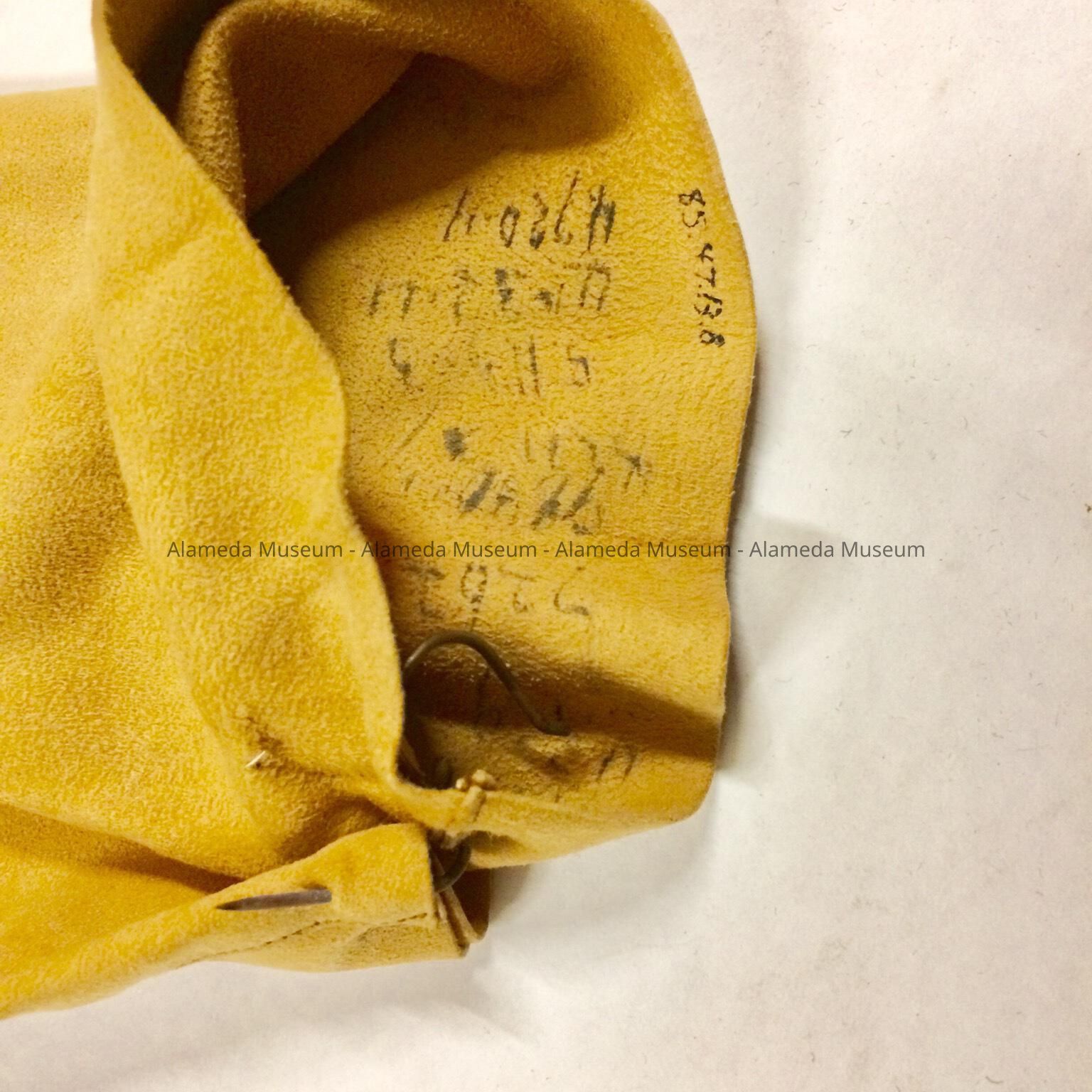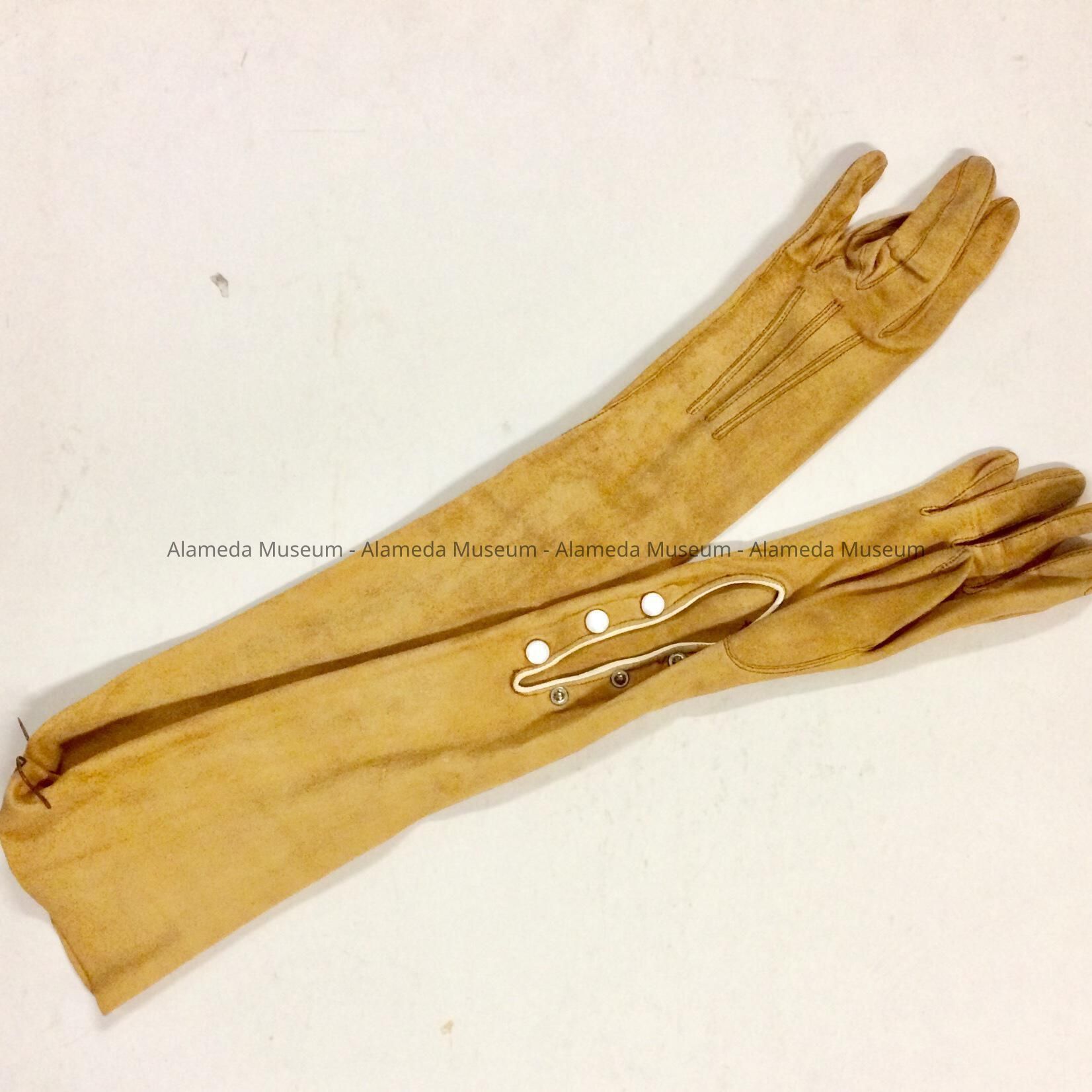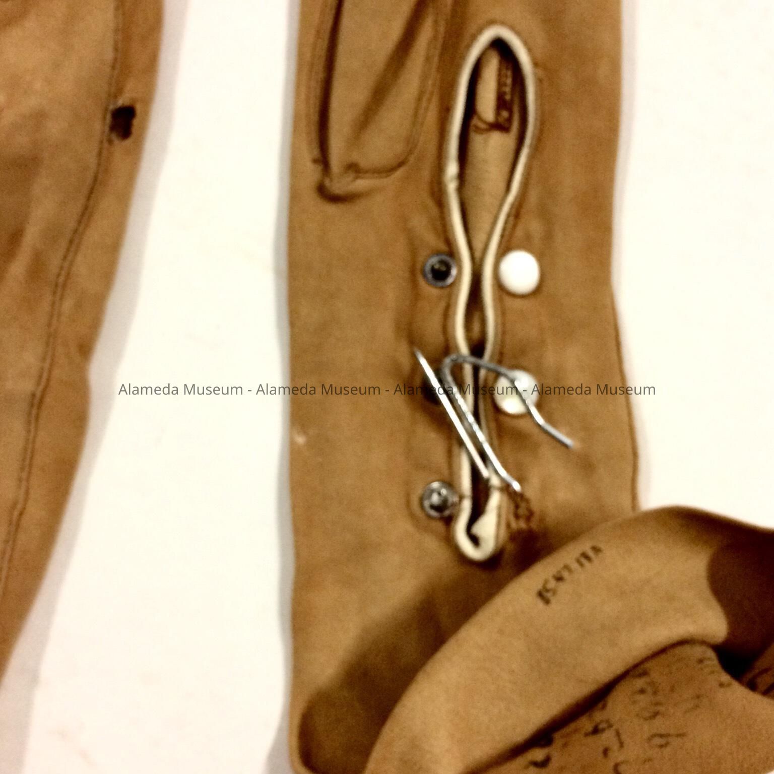 History of Object: Suede gloves of Harriet Holmes Haslett, wife of Samuel M., old-time residents of Alameda. Harriet married Samuel Montgomerie at Christ Church, Alameda, in 1887.