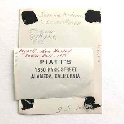 A: photo taken from a scrapbook or album, with remnants on verso, subject identified on reverse: 'Jeanne Anderson, Steven Rupp, 8th Grade Party EYC'. Date partially obscured by scrapbook paper remnants: [?]-24-56. Photographer unknown.