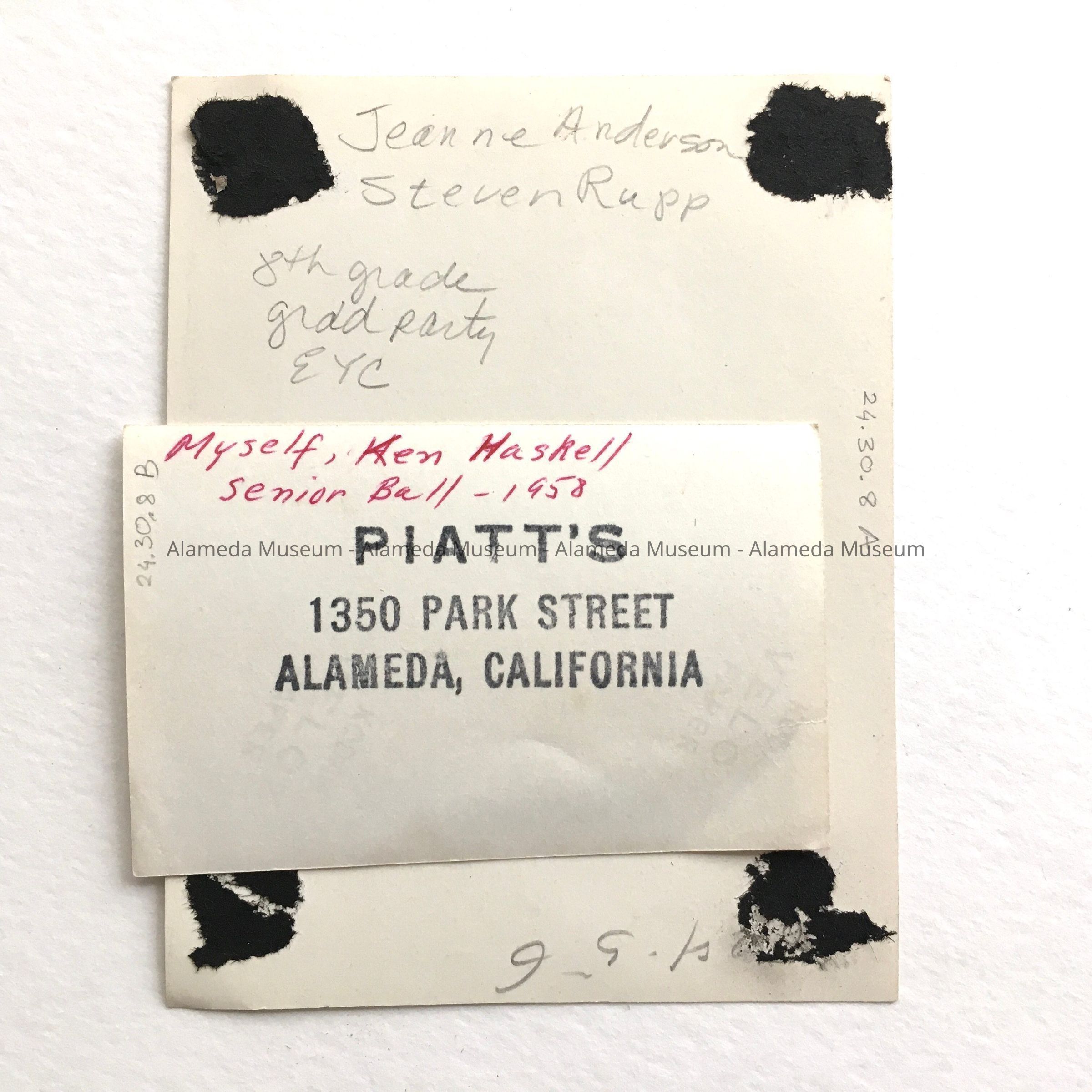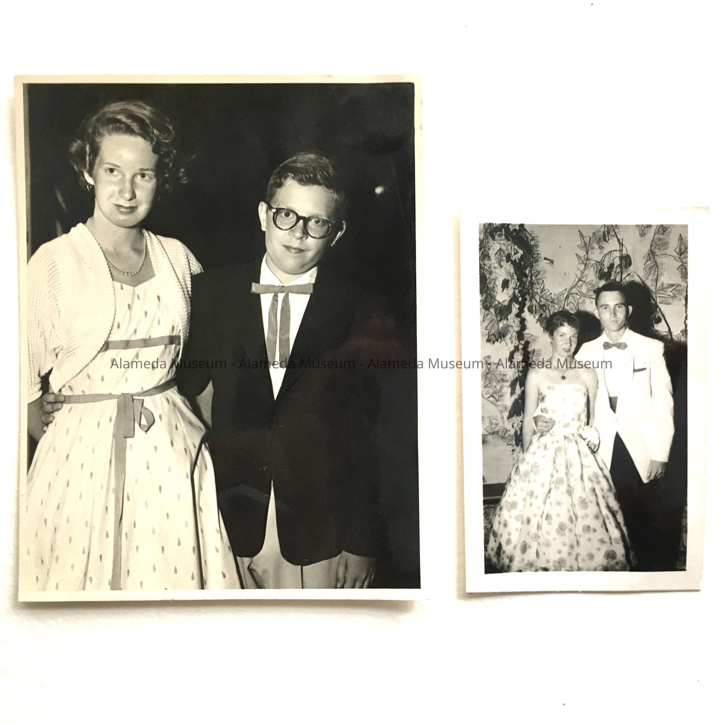 History of Object: Photos of the donor with an escort at class parties, 8th grade at the Encinal Yacht Club, 1956, and senior ball in 1958, displaying fashion choices for formal events of the period, and in the case of B., a period wallpaper style.