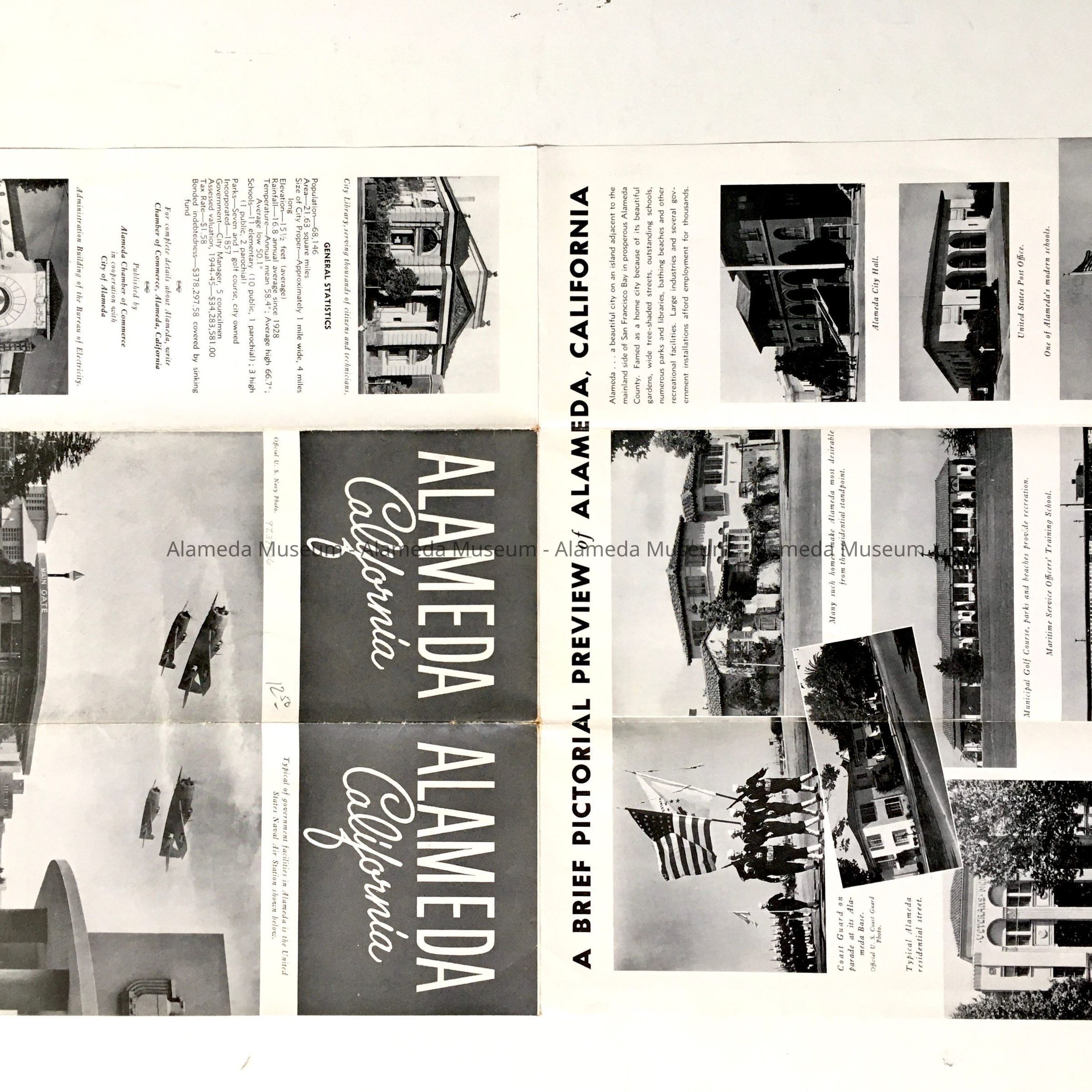 ILLUSTRATED PAMPHLET REPRESENTING THE CITY OF ALAMEDA, AND PRODUCED BY THE ALAMEDA CHAMBER OF COMMERCE. INTERIOR OF THE PAMPHLET, WHEN UNFOLDED, CONTAINS A STREET MAP OF THE CITY OF ALAMEDA, INCLUDING BAY FARM ISLAND.