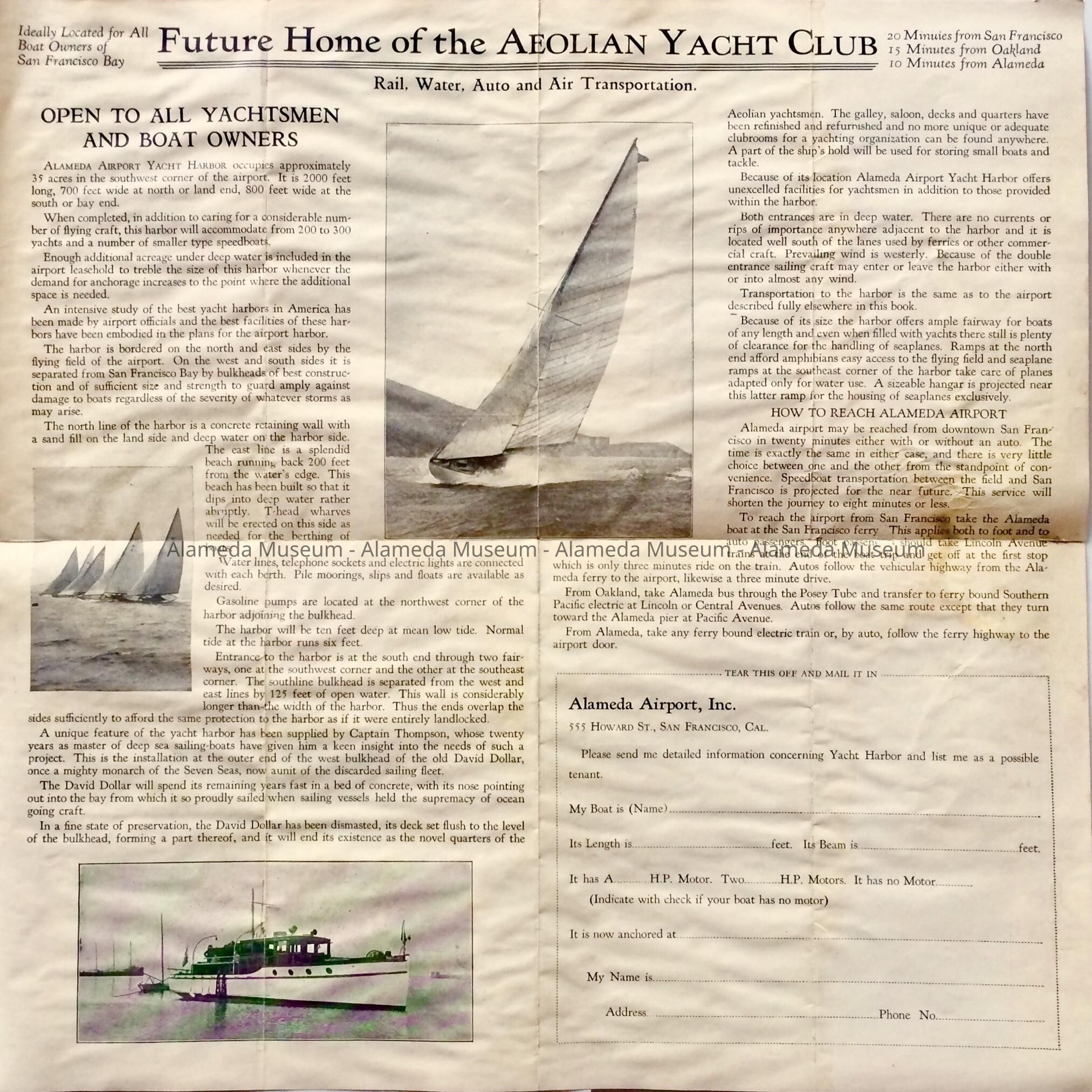 Pamphlet advertising a harbor for the Aeolian Yacht Club and Alameda Airport, c. 1930Entry/Object ID