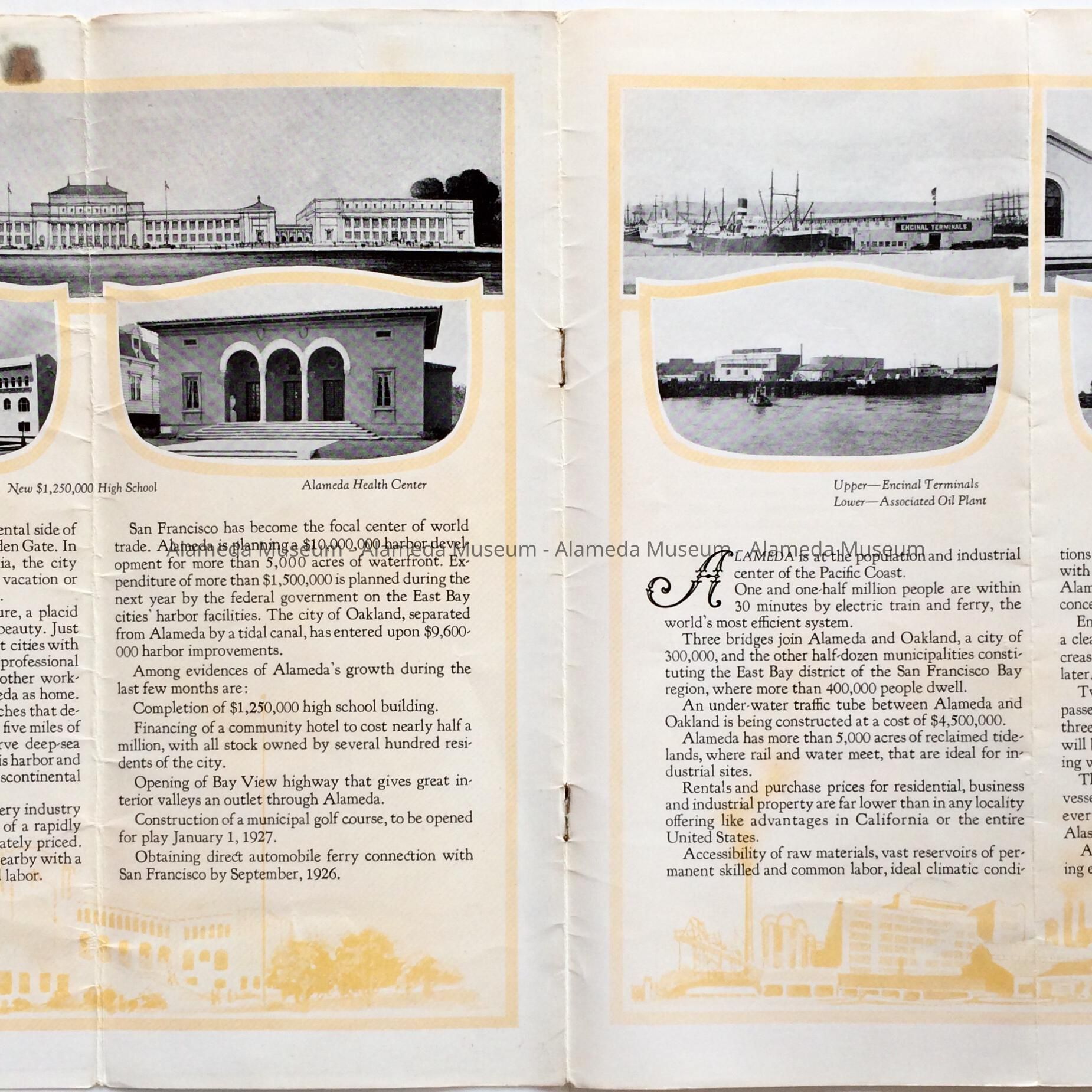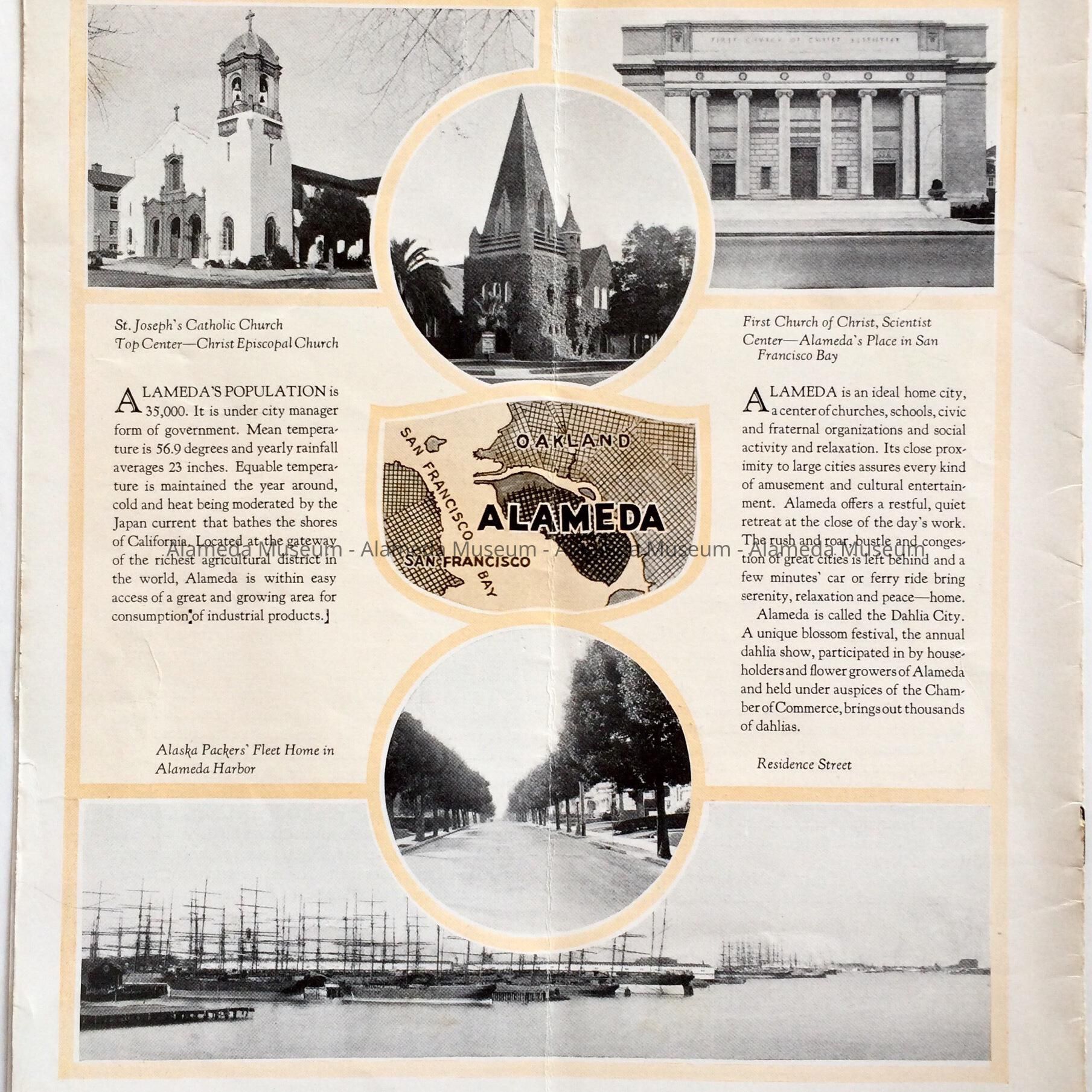History of Object: Pamphlet advertising the City of Alameda with illustrations of schools, churches and industry. The object was given to the Alameda Historical Society prior to 1971 and never catalogued.