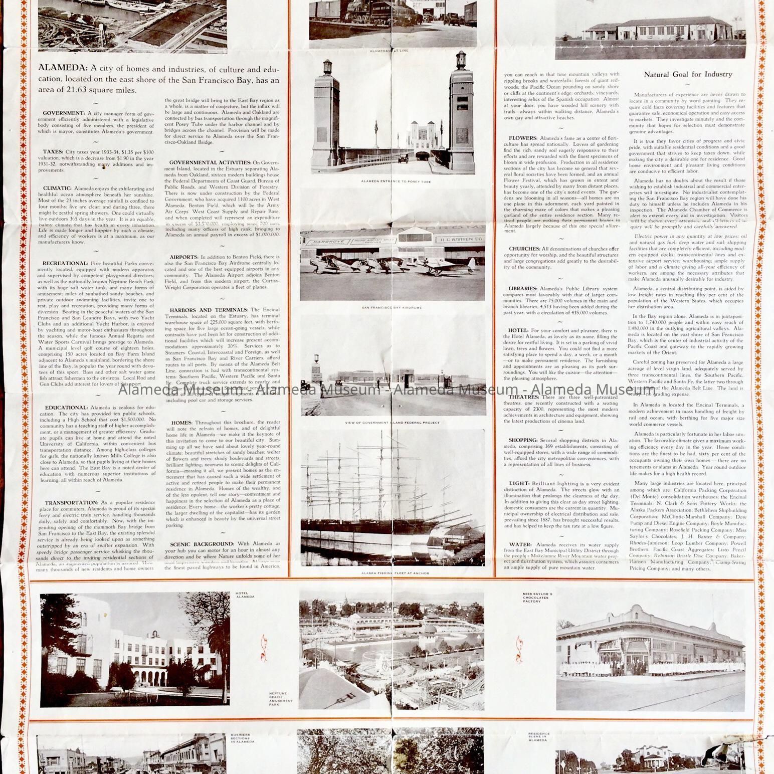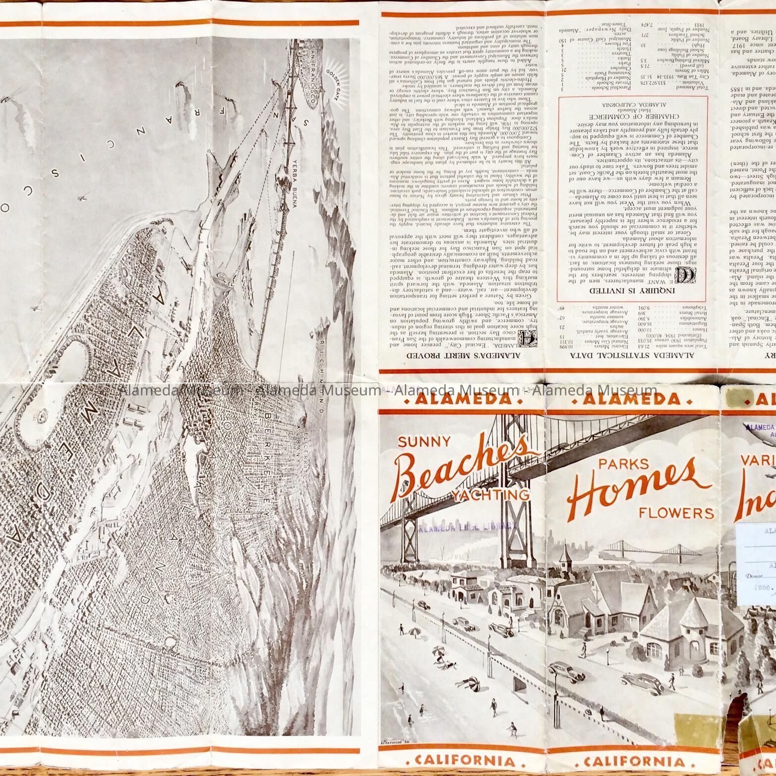 History of Object: Folding pamphlet, illustrated, giving details related to the City of Alameda. Possibly served as an advertisement of the City and issued by the Chamber of Commerce. Object given to the Alameda Historical Society in 1956 and never catalogued.