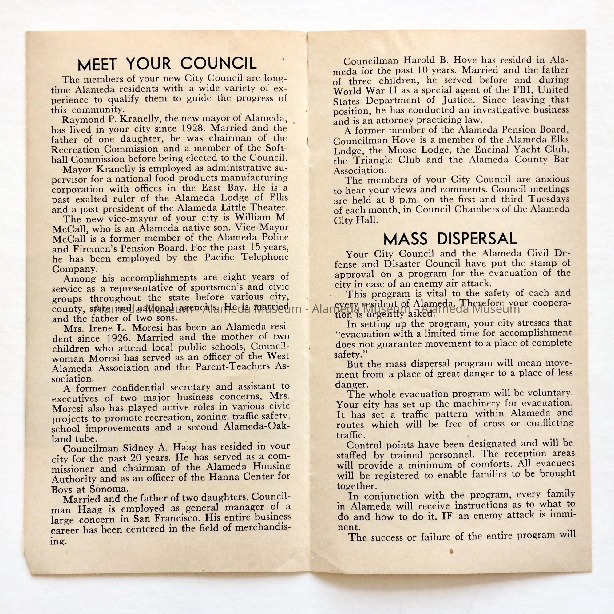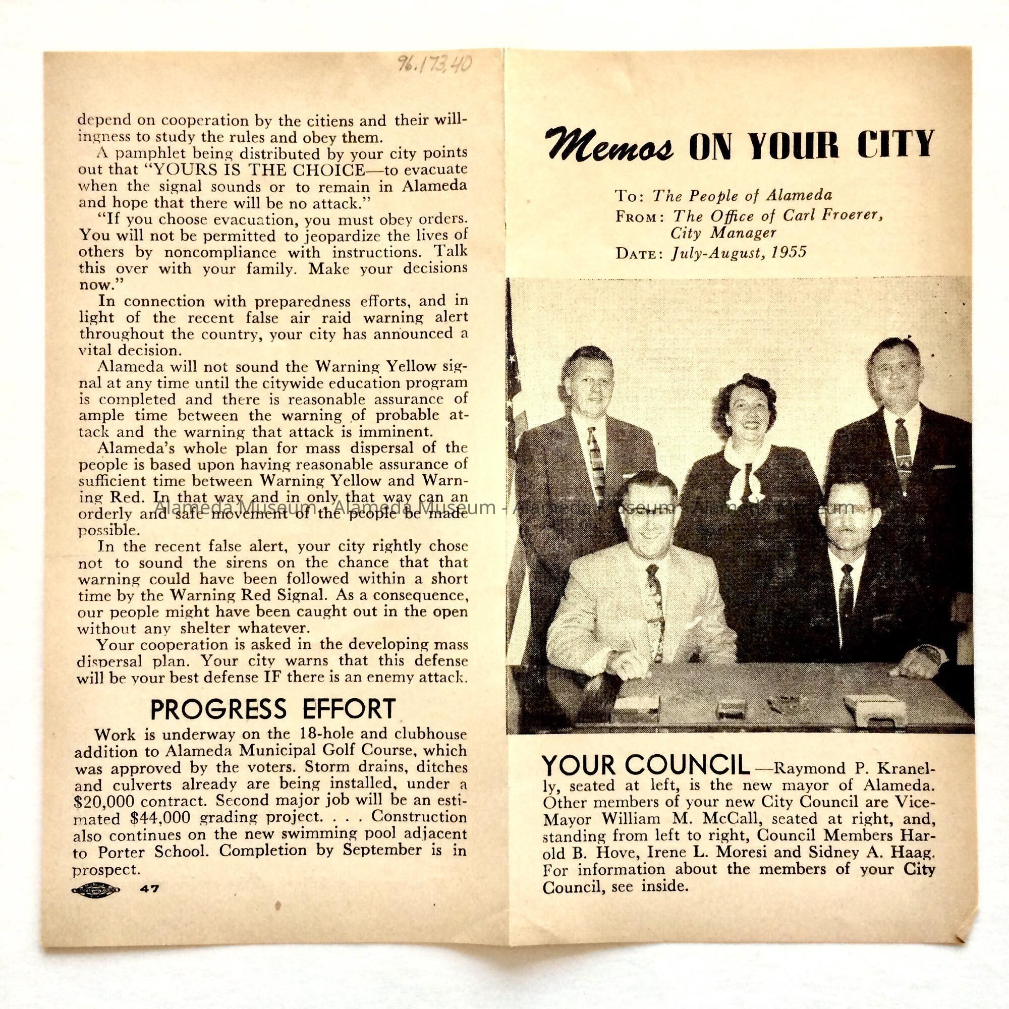 PAMPHLET ENTITLED, "MEMOS ON YOUR CITY," FROM THE OFFICE OF CARL FROERER, CITY MANAGER, DATED JULY AND AUGUST, 1955, AND CONTAINING BIOGRAPHIES OF THE THEN MAYOR AND MEMBERS OF THE CITY COUNCIL.
