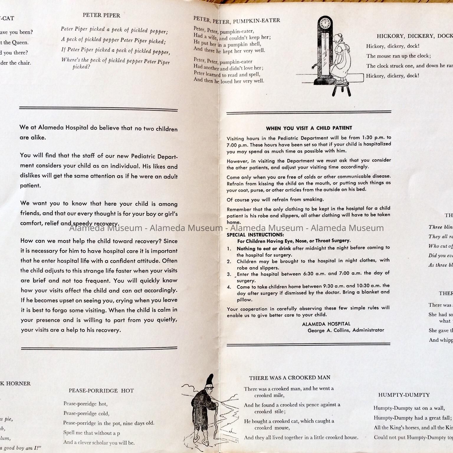 HISTORY OF OBJECT: A PAMPHLET TITLED, "NO TWO CHILDREN ARE ALIKE." THE PAMPHLET INCLUDES INFORMATION FOR CHILDREN AS PATIENTS OF THE HOSPITAL, AS WELL AS PRINTED NURSERY RHYMES.