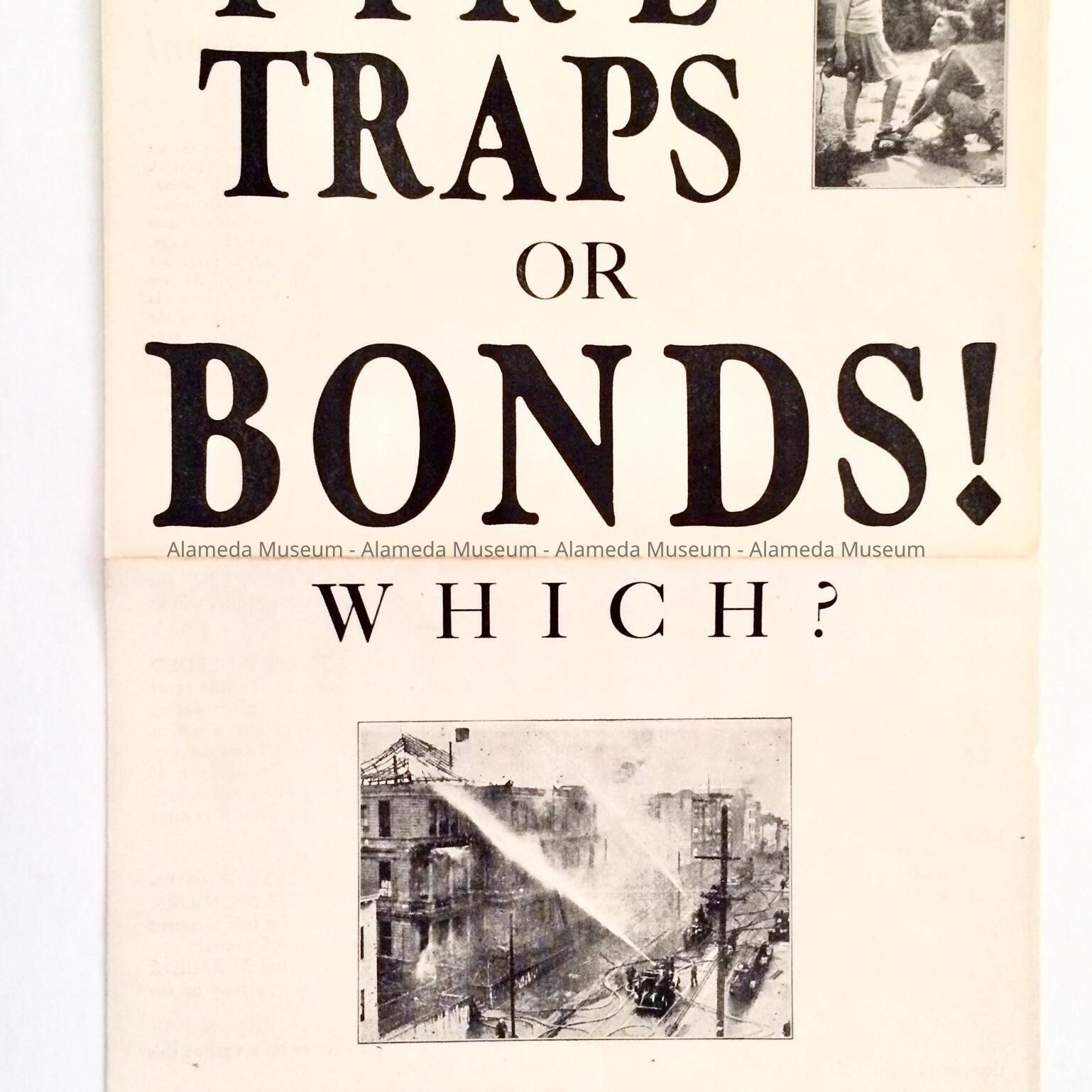 Illustrated pamphlet with bold heading "Fire Traps or Bonds!, Which?". Two pages.