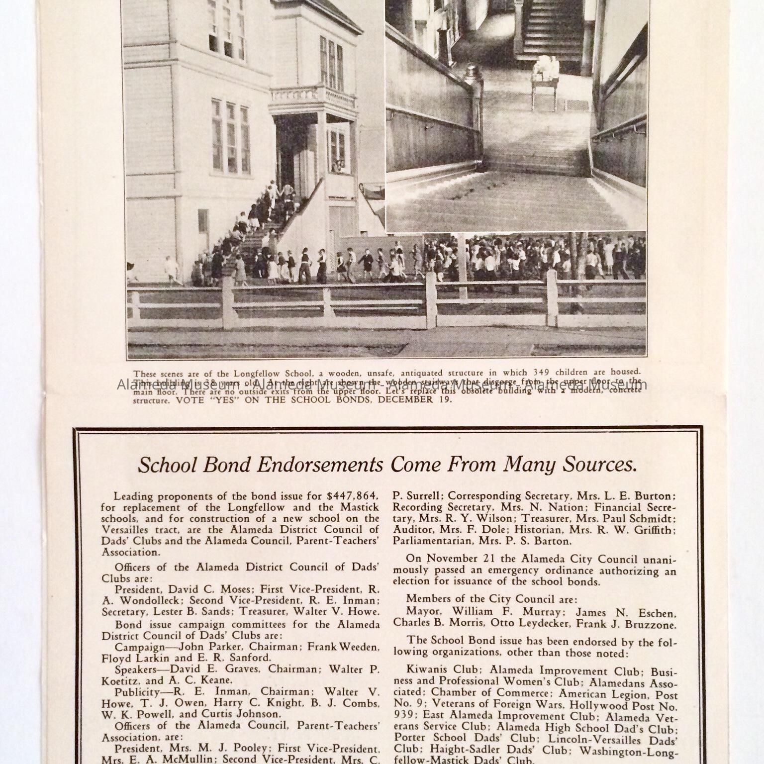 Pamphlet advocating the vote of "yes" on school bonds, Dec 19, 1933, to construct a new Mastick, Longfellow, and Edison Schools. The pamphlet contains interior & exterior photographs of Mastick & Longfellow Schools, erected 1891 & 1895.
