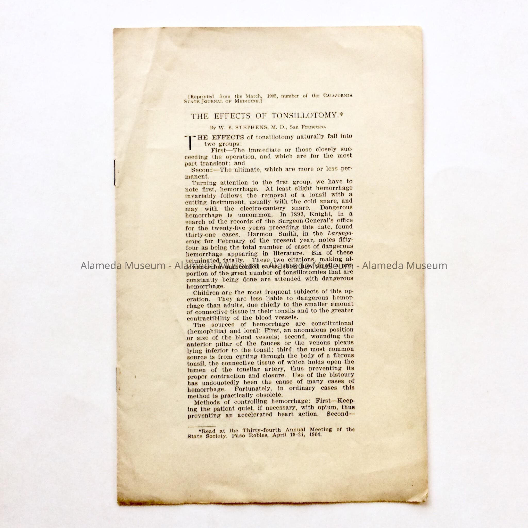 PAMPHLET ENTITLED "THE EFFECTS OF TONSILLOTOMY" BY W B STEPHENS, MD. HE WAS A LONGTIME RESIDENT OF THE CITY.