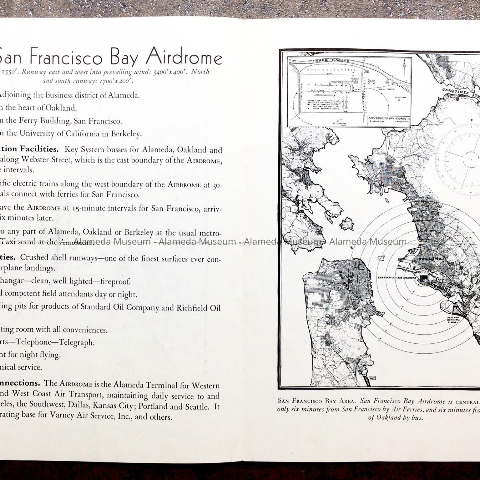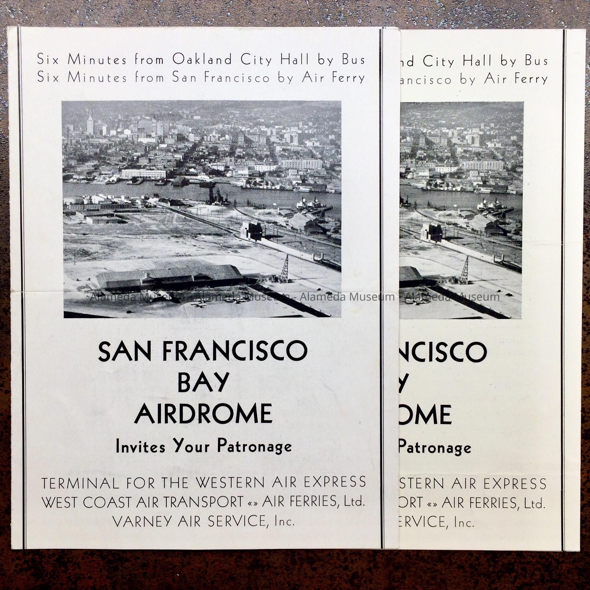 PAMPHLETS PRESENTING BASIC INFORMATION, RATES, ETC. FOR THE SAN FRANCISCO BAY AIRDROME. THEY INCLUDE ILLUSTRATIONS OF AN AERIAL PHOTOGRAPH DEPICTING THE HANGARS, AIRPLANES, AND SURROUNDINGS. BOTH THE POSEY TUBE AND ESTUARY CAN BE SEEN IN THE DISTANCE.