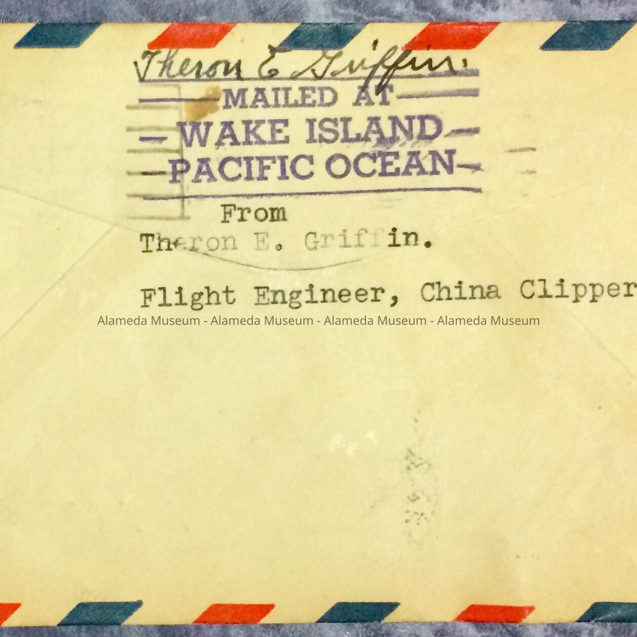 Envelope addressed to R. P. Bowman, San Francisco Bay Airdrome, from Theron E. Griffin, Flight Engineer, China Clipper. Sent on a historic first passenger flight from Wake Island, to Alameda, 1936.