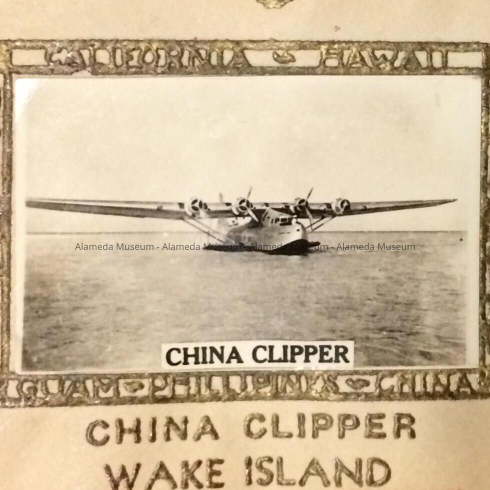 Description: Air mail envelope with printed heading in gold type "Pan American Airways" and illustrated with an attached stamp size photo of a "China Clipper" plane. Addressed to Mr. R. P. Bowman, S. F. Bay Airdrome, Alameda, Calif.