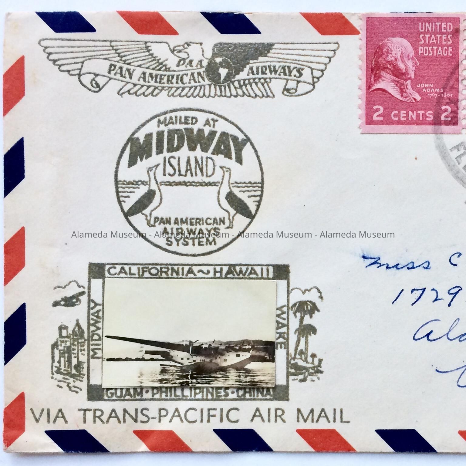 Description: AN AIRMAIL ENVELOPE WITH PRINTED LOGO, "PAN AMERICAN AIRWAYS," MAILED FROM MIDWAY ISLAND, P. A. SYSTEM. AN ADDITIONAL LOGO WITH A SEPIA-TINTED PHOTOGRAPH OF A SEA PLANE WITH THE CAPTION, "CALIFORNIA-HAWAII." THE ENVELOPE WAS HAND-ADDRESSED.