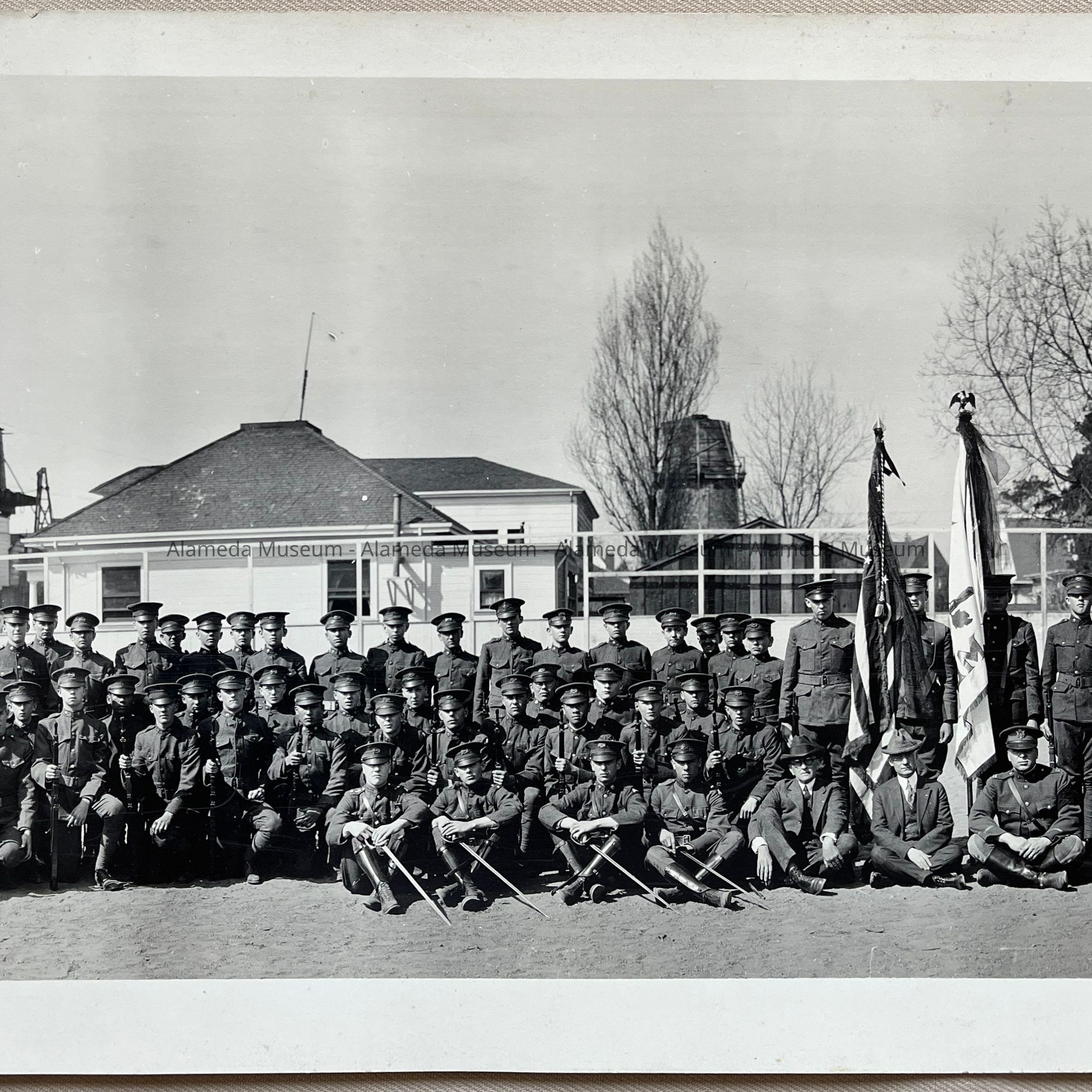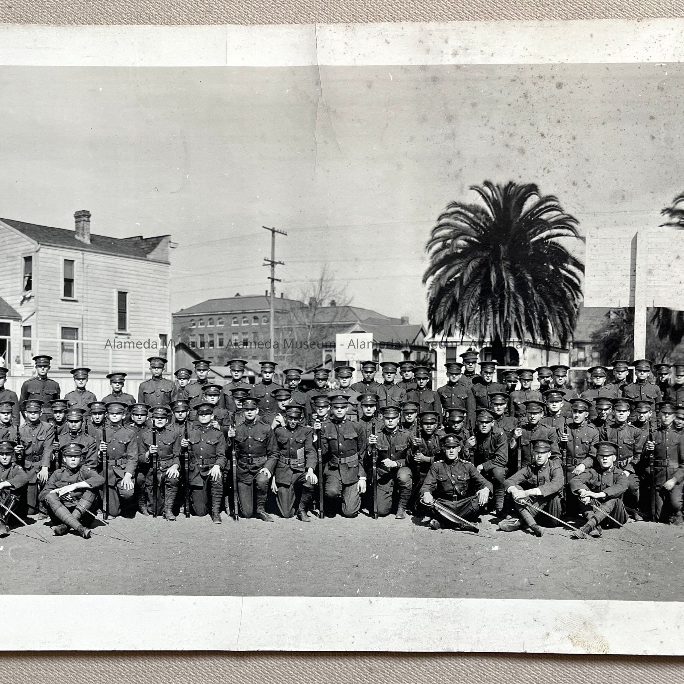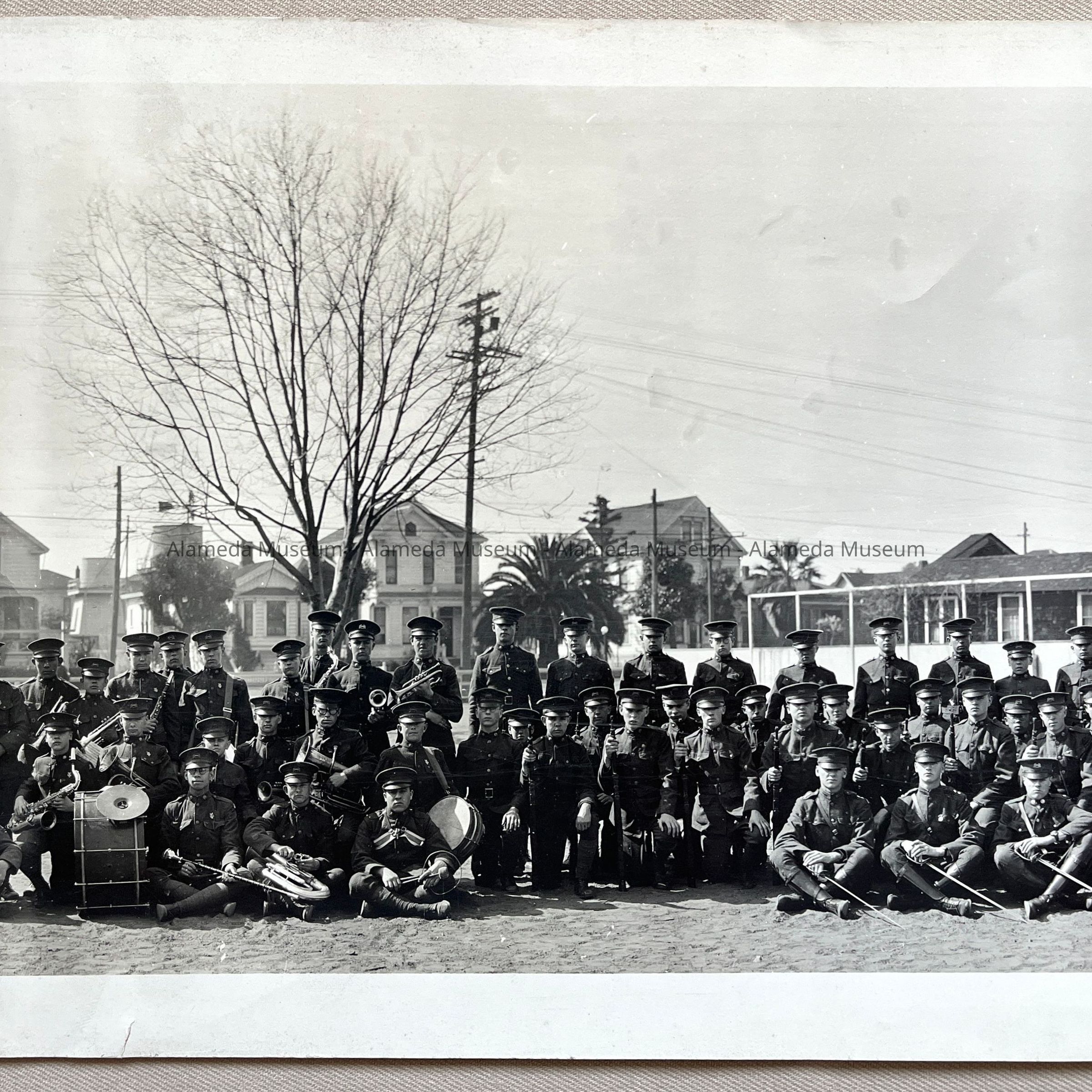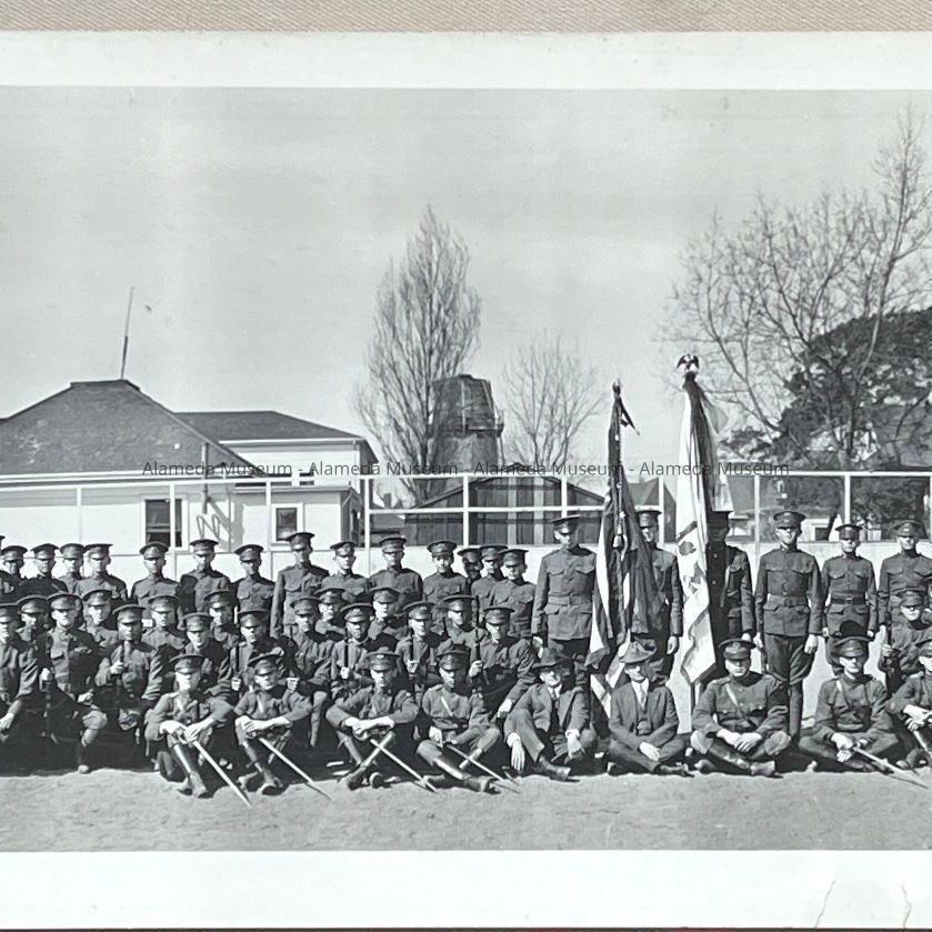 History of Object: Panoramic photograph of the Alameda High School ROTC, posed on the grounds of the Porter School. In the distance to the right can be seen the original Alameda High School erected 1902 at Walnut and Central.