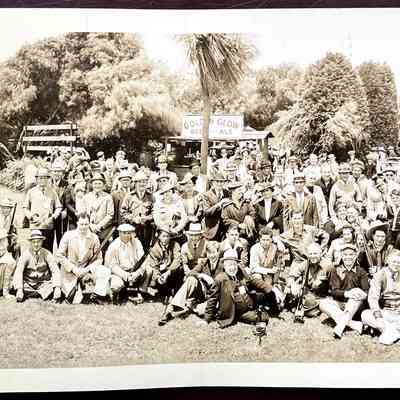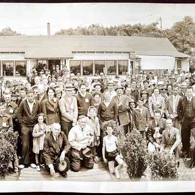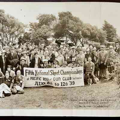 A PANORAMIC PHOTO OF MEMBERS, ETC. AT THE FIFTH NATIONAL SKEET CHAMPIONSHIPS OF THE PACIFIC ROD AND GUN CLUB, SAN FRANCISCO, AUGUST 8-12, 1939. THIS WAS A COMBINED EFFORT WITH THE ALAMEDA GUN CLUB.