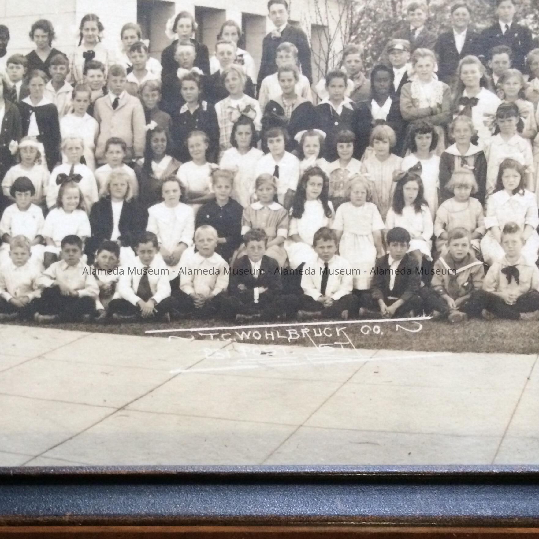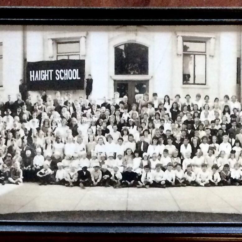 History: Panoramic Photograph of the student body and staff of the Haight Elementary School, G.E. Furbush, Principal, dated May 20, 1918. The photograph is signed by T.C. Wohlbruch Co., San Francisco prolific school photographers of the period. The donor's late mother, Alice Gibson Durein, is pictured somewhere in the assembly. In the background is the main entrance to the second Haight School constructed of masonry.