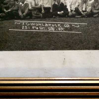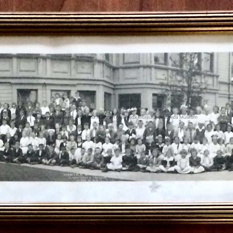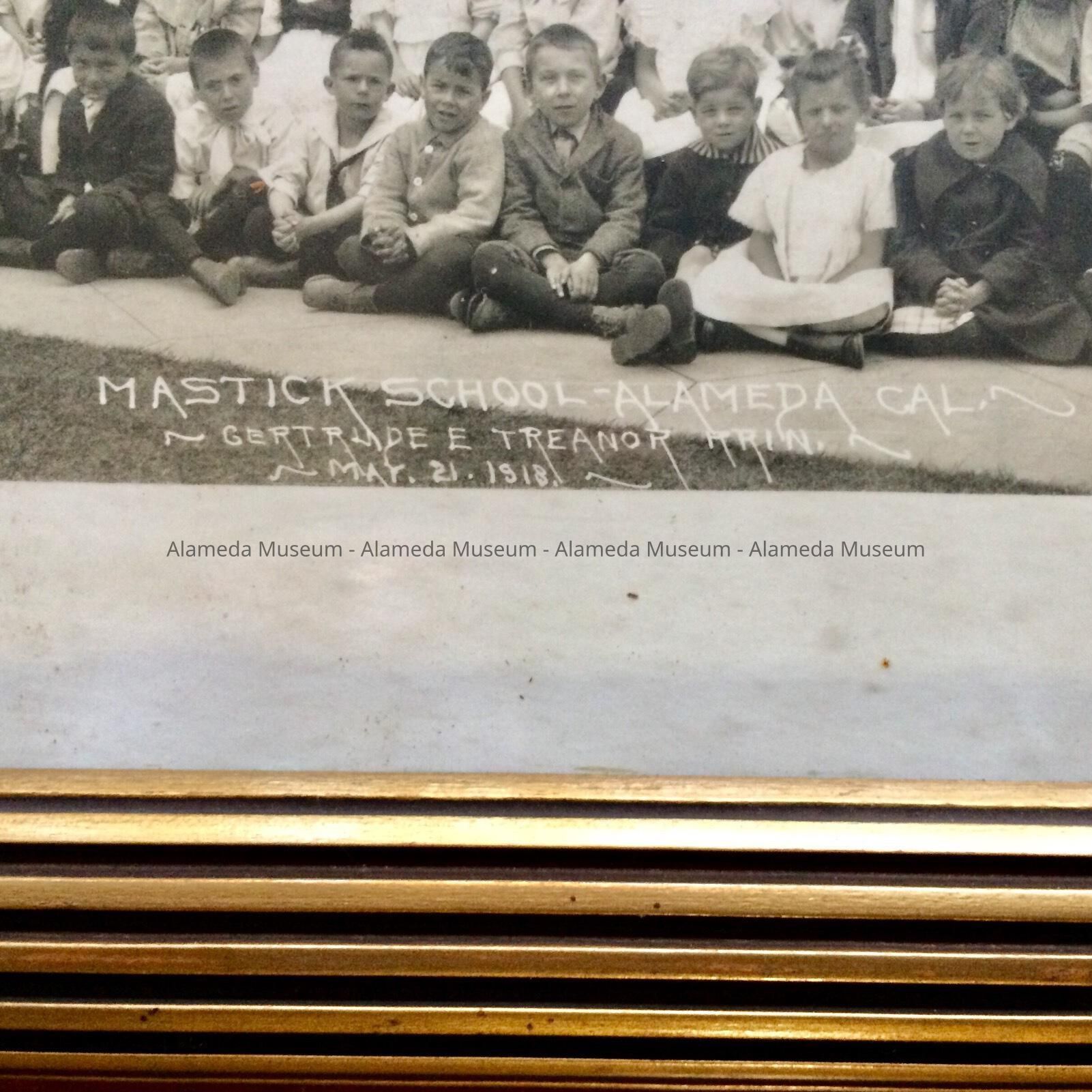 DESCRIPTION: A BLACK AND WHITE PHOTO IN AN ANTIQUE GOLD COLORED FRAME THAT HAS AN INSCRIPTION ON THE NEGATIVE, "MASTICK SCHOOL, ALAMEDA, CAL., GERTRUDE E. TREANOR, PRINCIPAL, MAY 21, 1918." PHOTO IS SIGNED," T. C. WOHLBRUCK CO., 251 POST ST., SAN FRANCISCO."