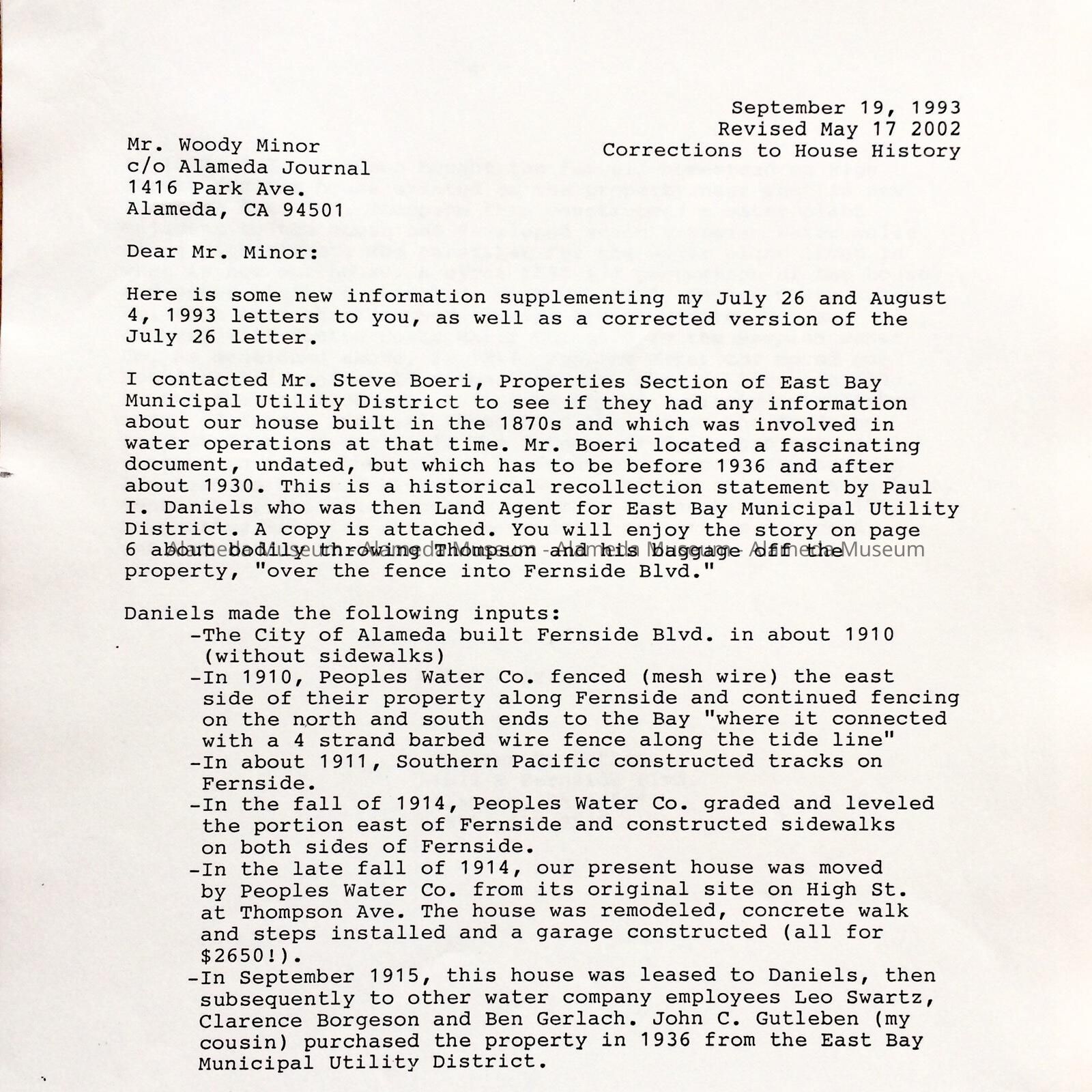 Paper and letter about home at 1622 Fernside Blvd, 2002Entry/Object ID