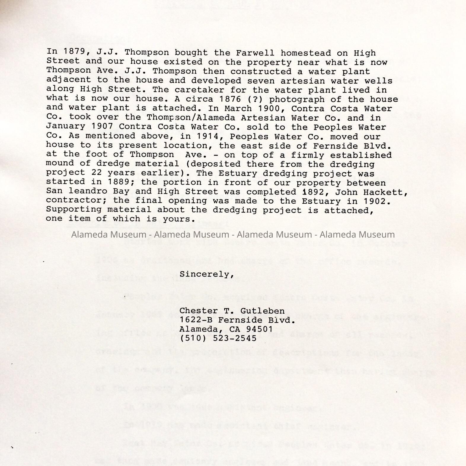 HISTORY OF OBJECT: A RESEARCH PAPER ON A HOME PRESENTLY OWNED AND OCCUPIED BY THE DONOR. HOME WAS SITUATED ON HIGH STREET NEAR THOMPSON AVENUE, AND HAS BEEN MOVED TO ITS PRESENT LOCATION AT 1622 FERNSIDE BLVD, ALAMEDA. THE DONOR HAS CONDUCTED EXTENSIVE RESEARCH ON THE ORIGINAL SITE OF THE HOUSE, INCLUDING ITS RELOCATION AND OTHER DETAILS.