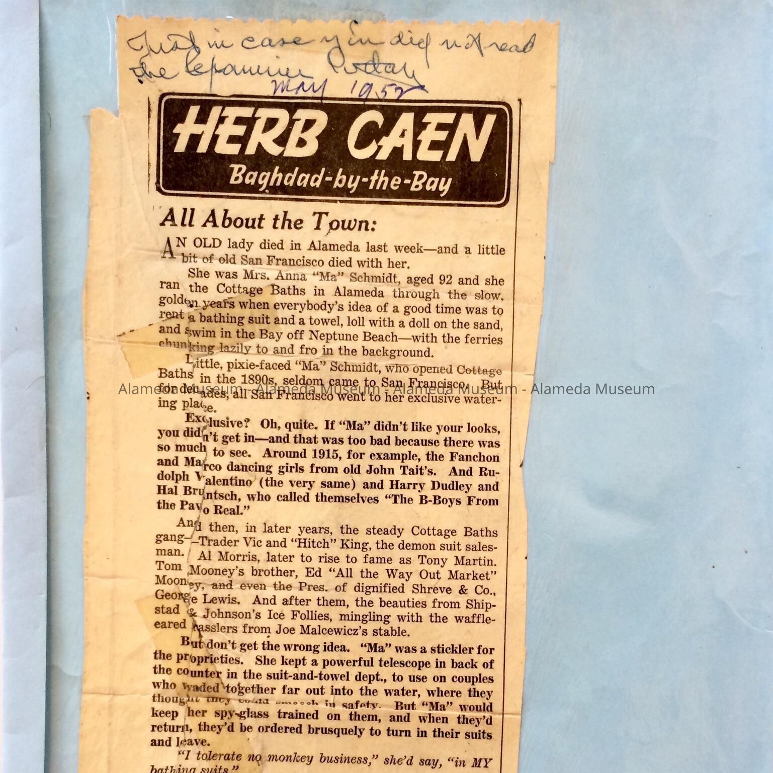HISTORY OF OBJECT: SUBJECT OF CLIPPING RELATES TO MRS. ANNA "MA" SCHMIDT, OWNER OF COTTAGE BATHS IN ALAMEDA. AND REFERS TO SOME OF THE INCIDENTS THAT OCCURRED THERE, DURING HER OWNERSHIP.