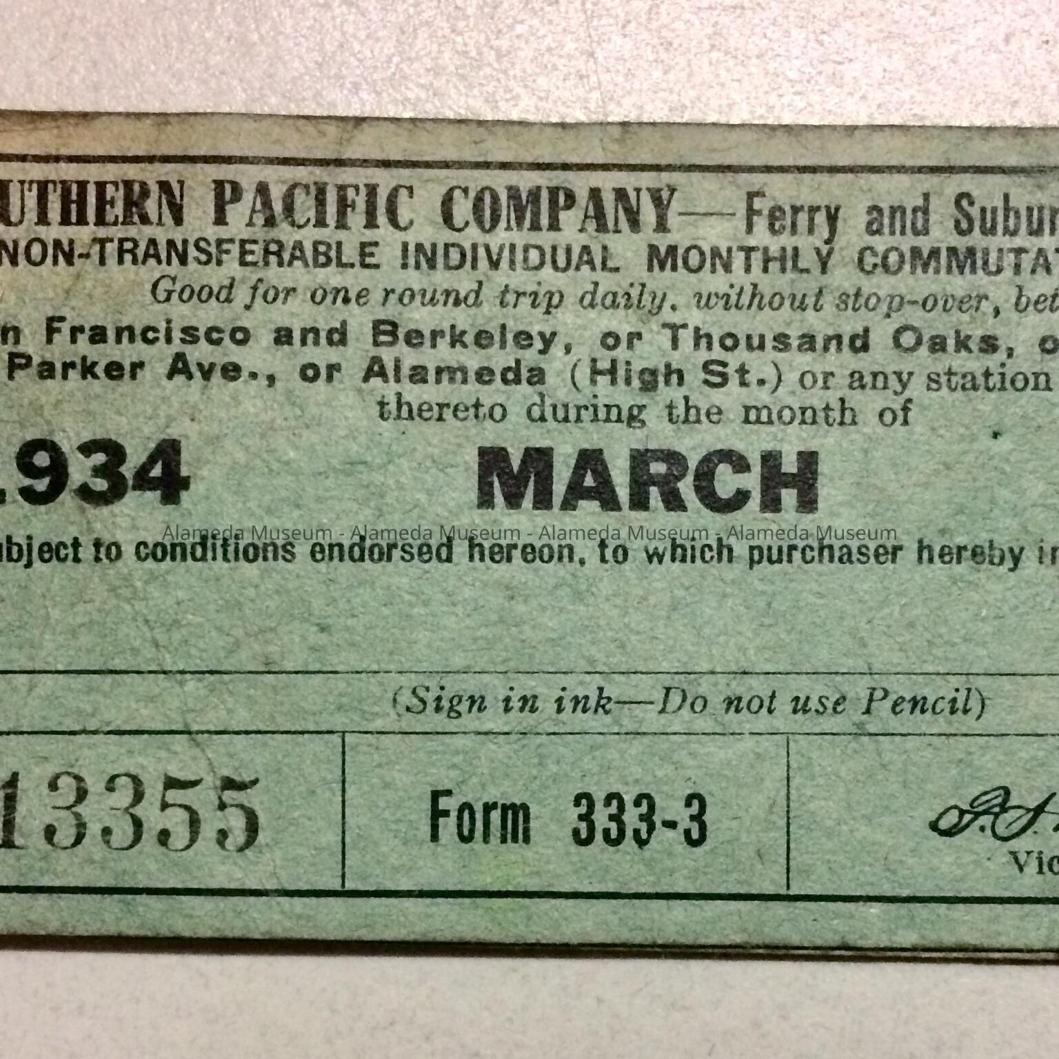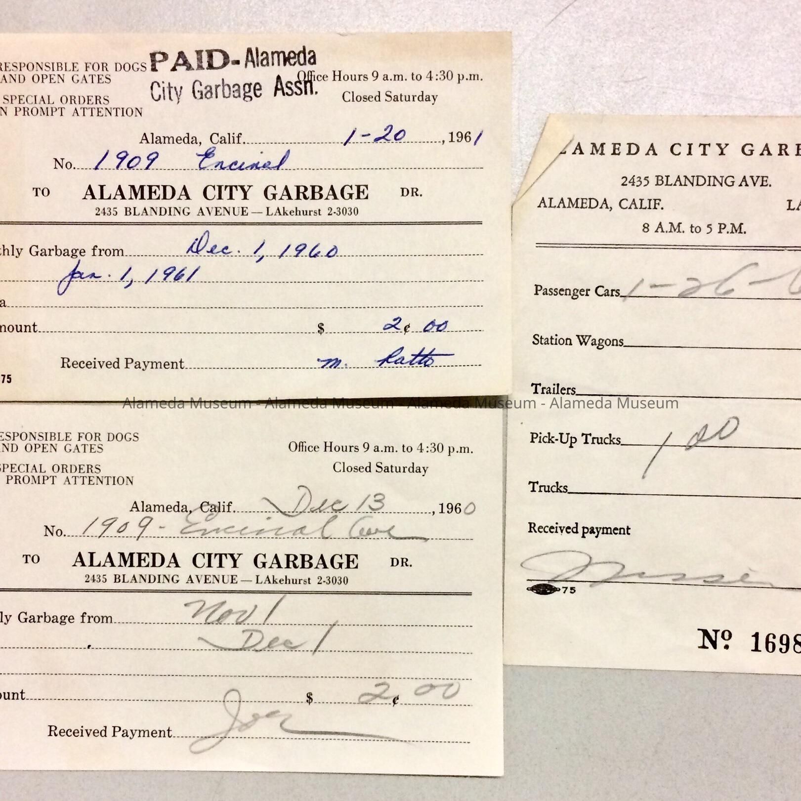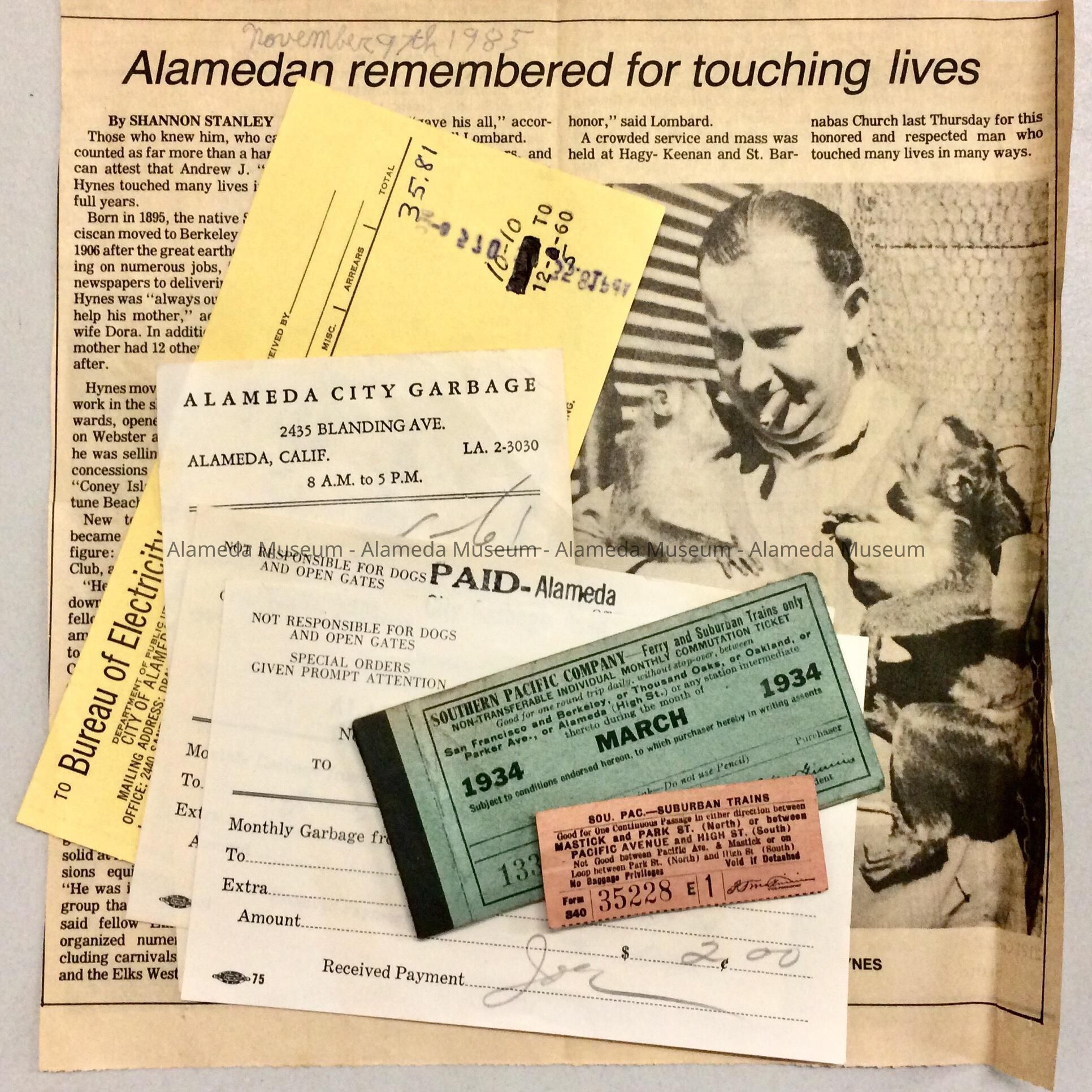 Description: Alameda-related paper ephemera: A: green Southern Pacific Company ferry and suburban trains ticket book for March 1934, with tickets left for 4 days; B: pink Southern Pacific Suburban Trains ticket from 1935; C: yellow Bureau of Electricity Bill for 1909 Encinal Ave, c. 1960; D: December 1960 Bill for City Garbage for 1909 Encinal Ave, received signature unreadable; E: January 1961 receipt / City Garbage bill for 1909 Encinal Ave., stamped paid and signed M. Ratto; F: 1961 City Garbage 'passenger car' bill / receipt; G: Newspaper clipping, paper unknown, dated November 9th, 1985, title 'Alamedan remembered for touching lives'.