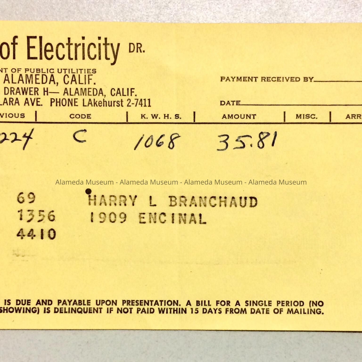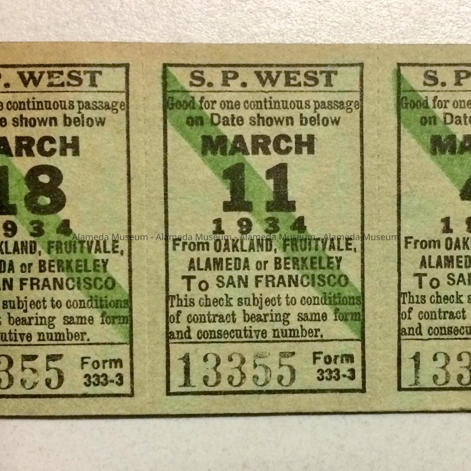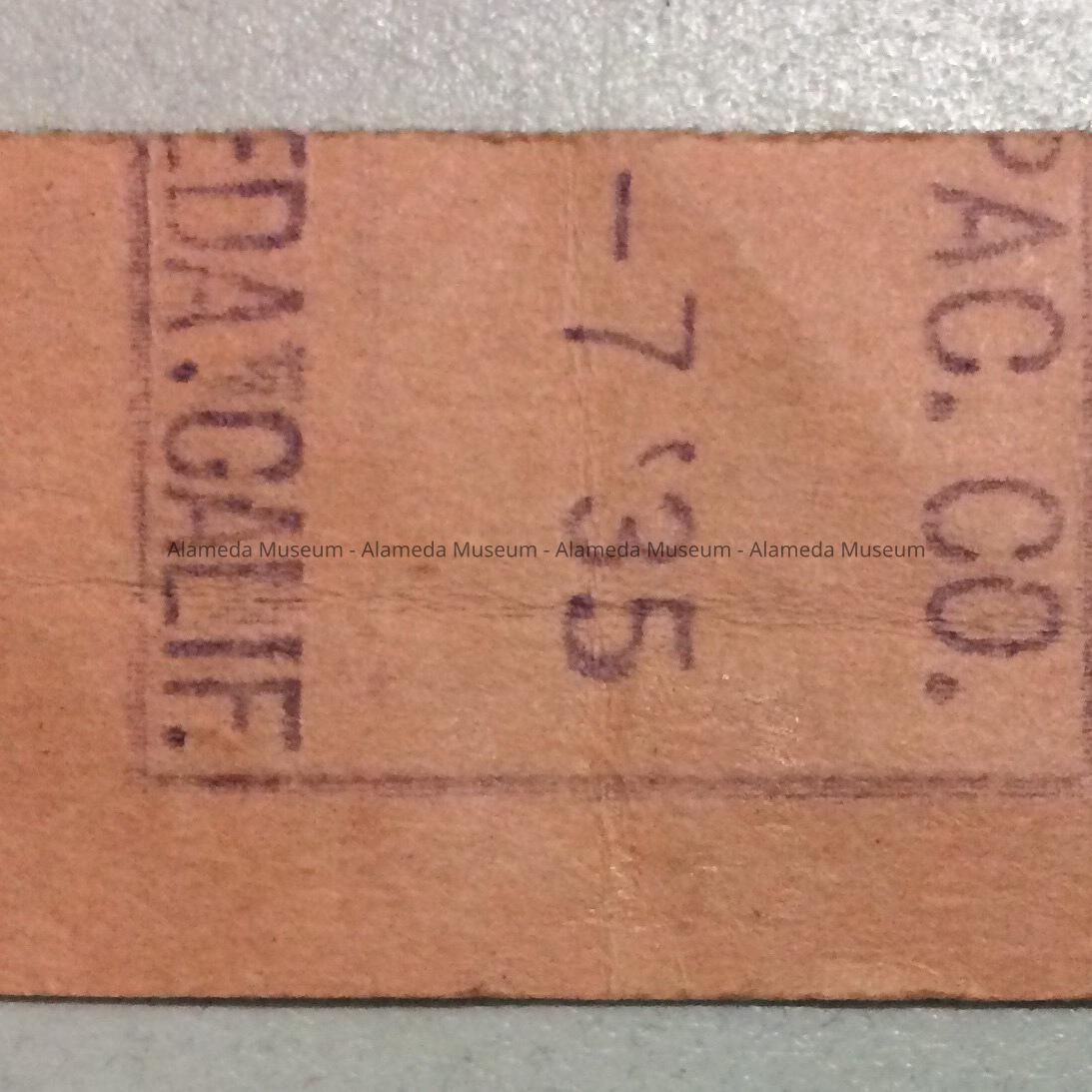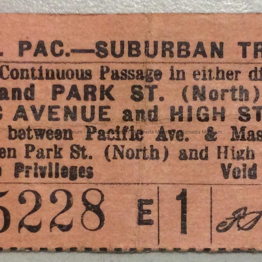 Description: Alameda-related paper ephemera: A: green Southern Pacific Company ferry and suburban trains ticket book for March 1934, with tickets left for 4 days; B: pink Southern Pacific Suburban Trains ticket from 1935; C: yellow Bureau of Electricity Bill for 1909 Encinal Ave, c. 1960; D: December 1960 Bill for City Garbage for 1909 Encinal Ave, received signature unreadable; E: January 1961 receipt / City Garbage bill for 1909 Encinal Ave., stamped paid and signed M. Ratto; F: 1961 City Garbage 'passenger car' bill / receipt; G: Newspaper clipping, paper unknown, dated November 9th, 1985, title 'Alamedan remembered for touching lives'.