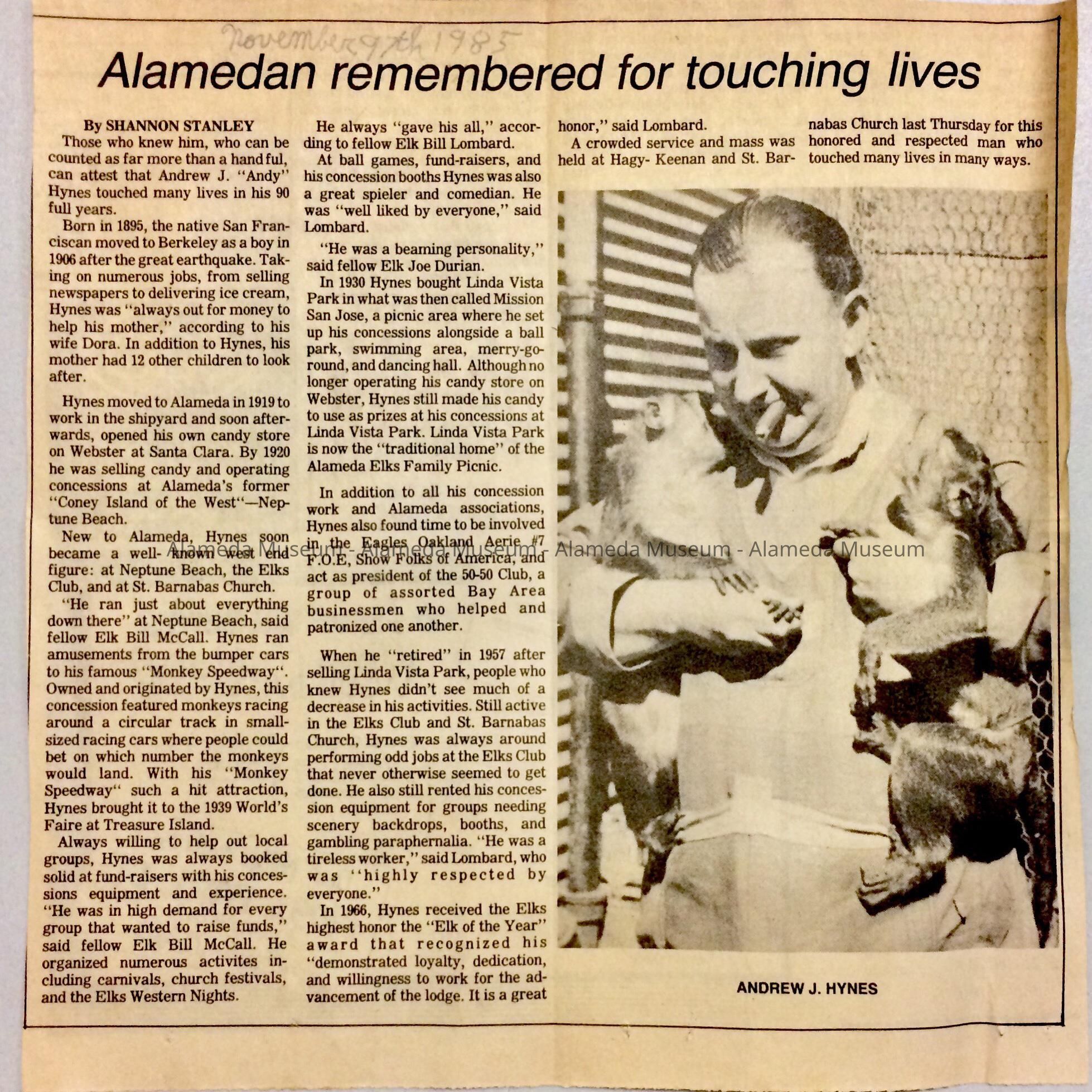 History of Object: Paper ephemera saved by Harry Branchaud, who in the 60s lived at 1909 Encinal Ave. Clipping G discusses Andrew (Andy) Hynes (1895-1985), who after working an Alameda shipyard, opened a candy store on Webster and Santa clara, and later ran concessions at Neptune Beach, including the Monkey Speedway.