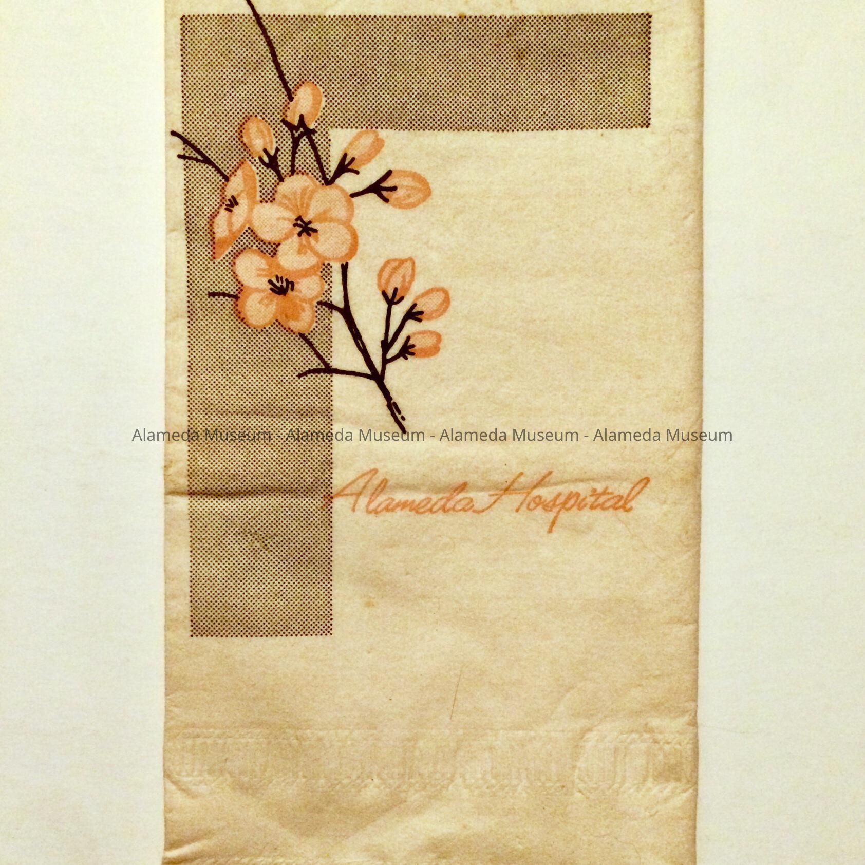 DESCRIPTION: A PAPER NAPKIN ILLUSTRATED WITH FLOWERS AND THE NAME, "ALAMEDA HOSPITAL."