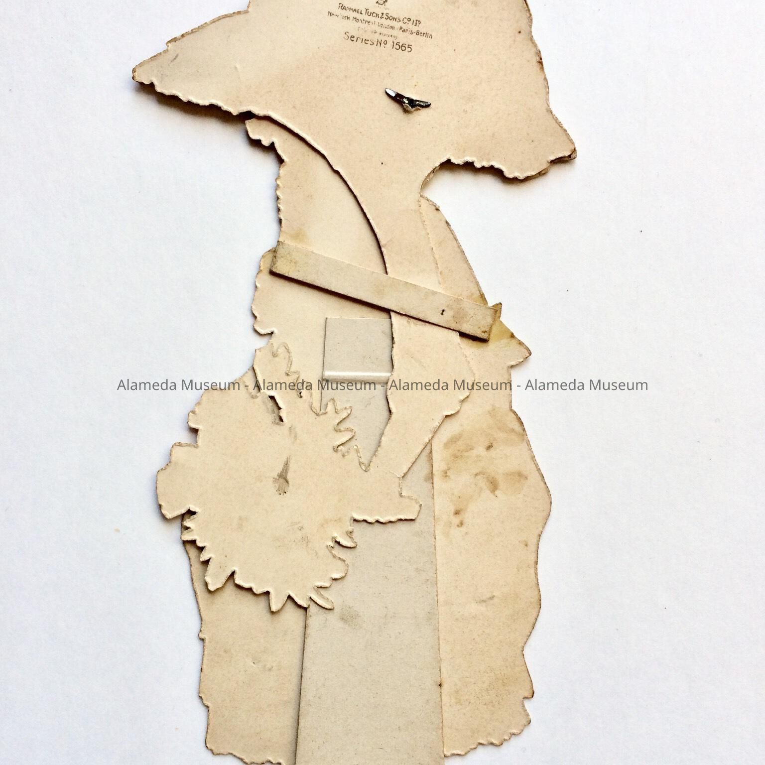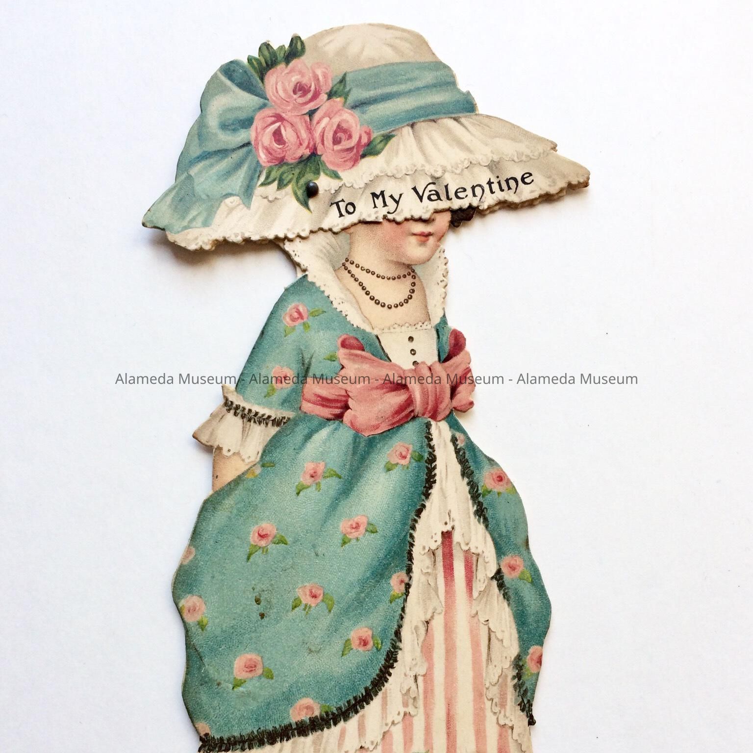 A MECHANICAL PAPER VALENTINE, DEPICTING A YOUNG GIRL IN PERIOD DRESS. PRINTED ON HER HAT IS THE CAPTION, "TO MY VALENTINE."