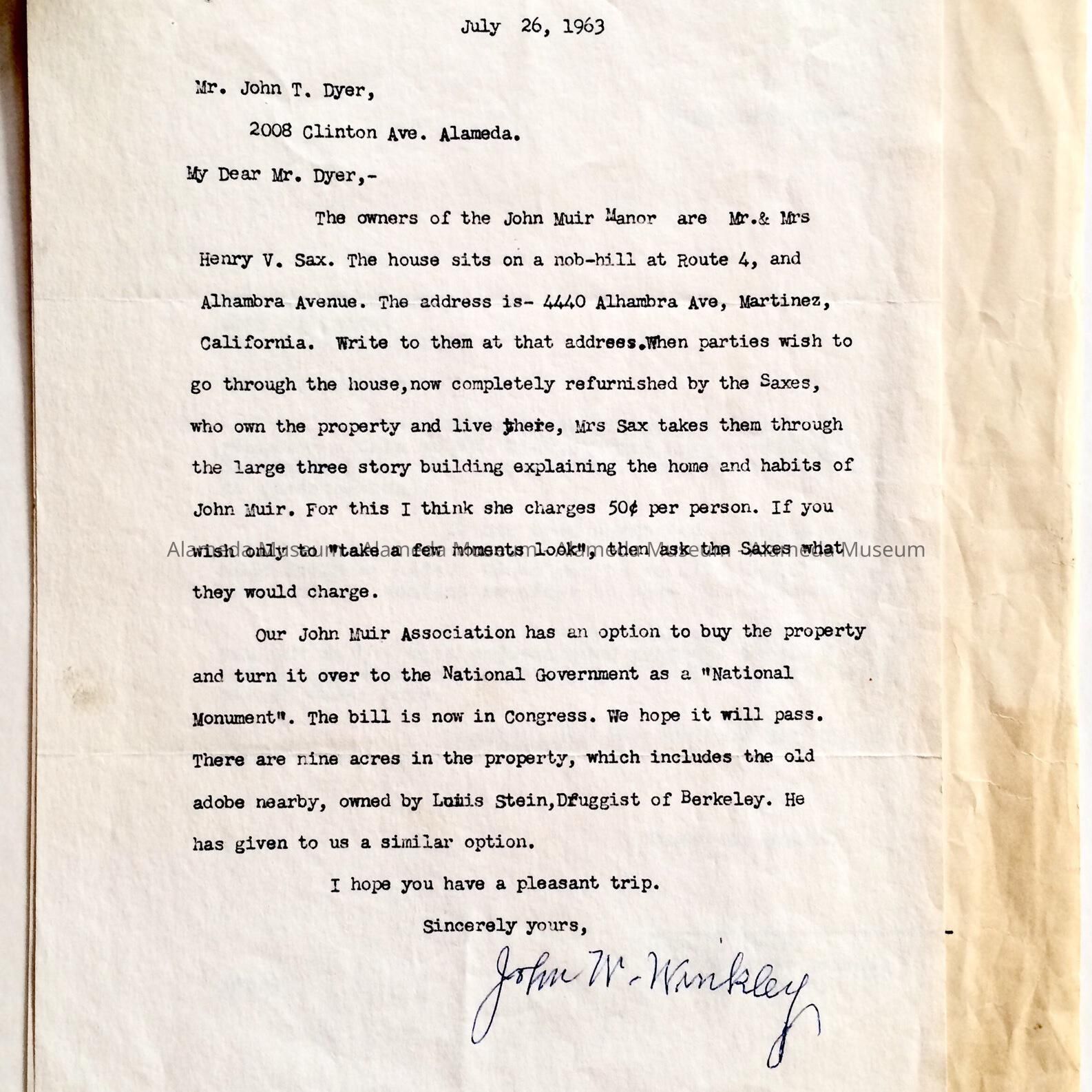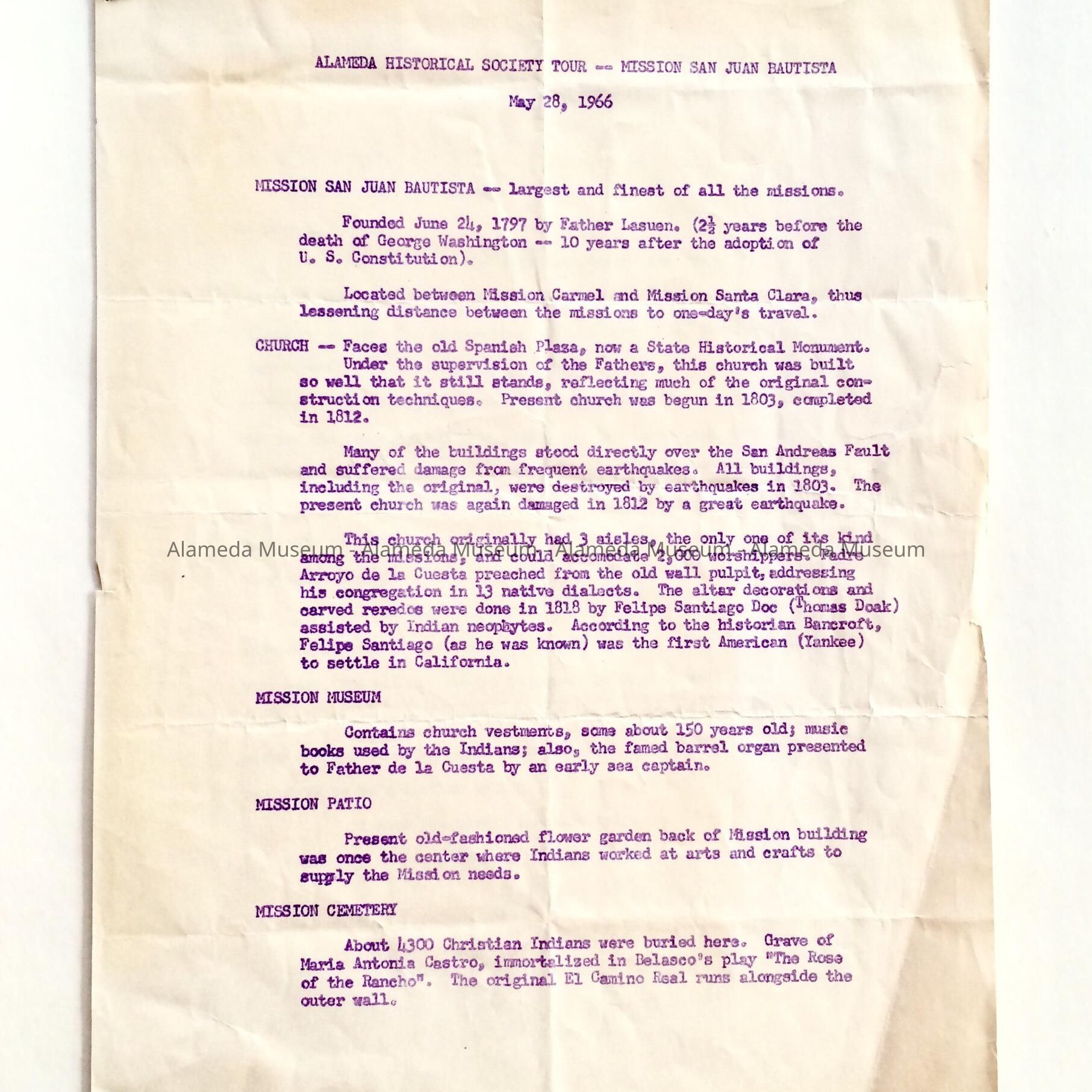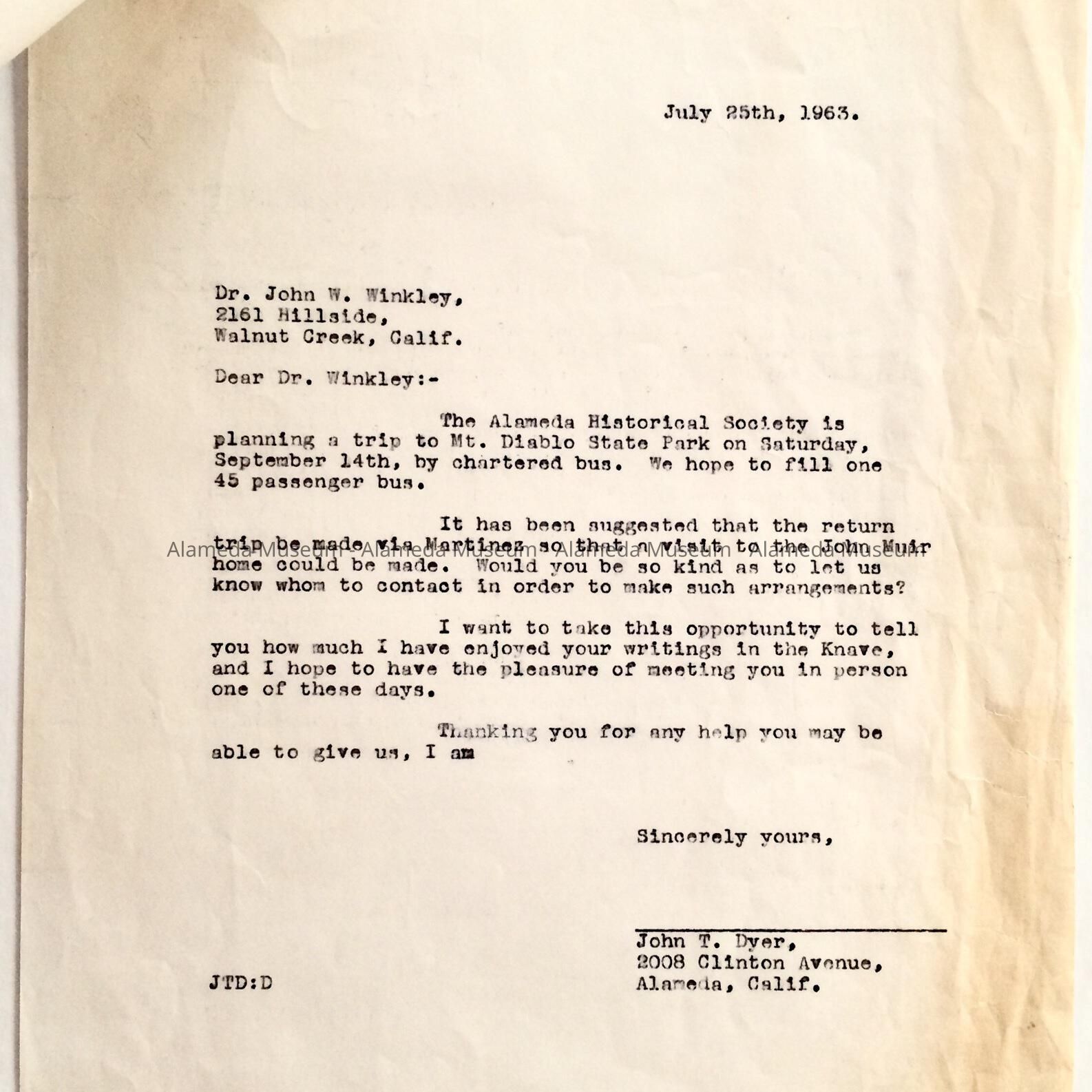 Flyer and letters concerning early activities of the Alameda Historical Society, one being a flyer concerning a trip to Mission San Juan Bautista, a letter addressed to John T. Dyer concerning a tour of the Muir Mansion and another letter about a planned trip by the Society to Mt. Diablo. Both letters involve Mr. John T. Dyer who with his wife, Dorothy, were long-term members of the Alameda Historical Society.