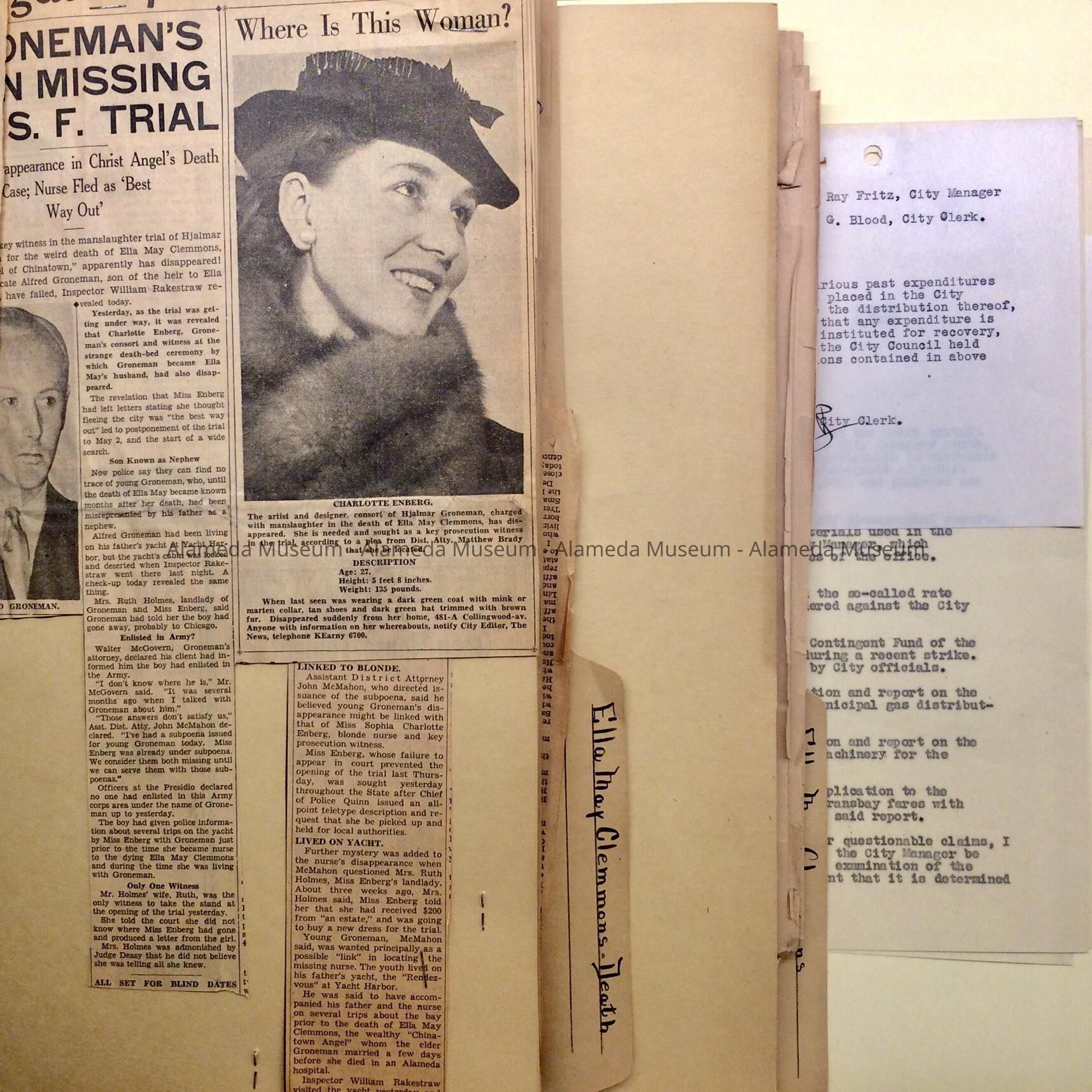 Papers about the death of longtime S.F. resident Miss Ella May Clemmons, also known as ‘the Christ Angel of Chinatown’, an heiress (via her sister Viola Katherine, stage name Katherine Dayan, an actress who had married Howard Gould, heir to the fortune of Jay Gould). She was called the Angel of Chinatown because of her association with a Mr. Wong. Less than 2 weeks before her death she had married her Chiropractor, Alfred Groneman, who until then had been living with designer Charlotte Enberg. After the marriage, Clemmons had been moved on a stretcher to a rented apartment at 1117 Park Street, where she died, attended by Enberg and Groneman. The story started when the landlady, Mrs. Tawse, requested help in fumigating the apartment from Miss McMaster at the Health Department. The story was brought to police officer Angelina Floyd, who reported to Chief of Police Vern Smith, who reported to City Manager Ray Fritz, who requested the further investigation. The money for the attorneys, background research, and other fees took out a large part of the Police Department’s Fund, which had to be refunded.