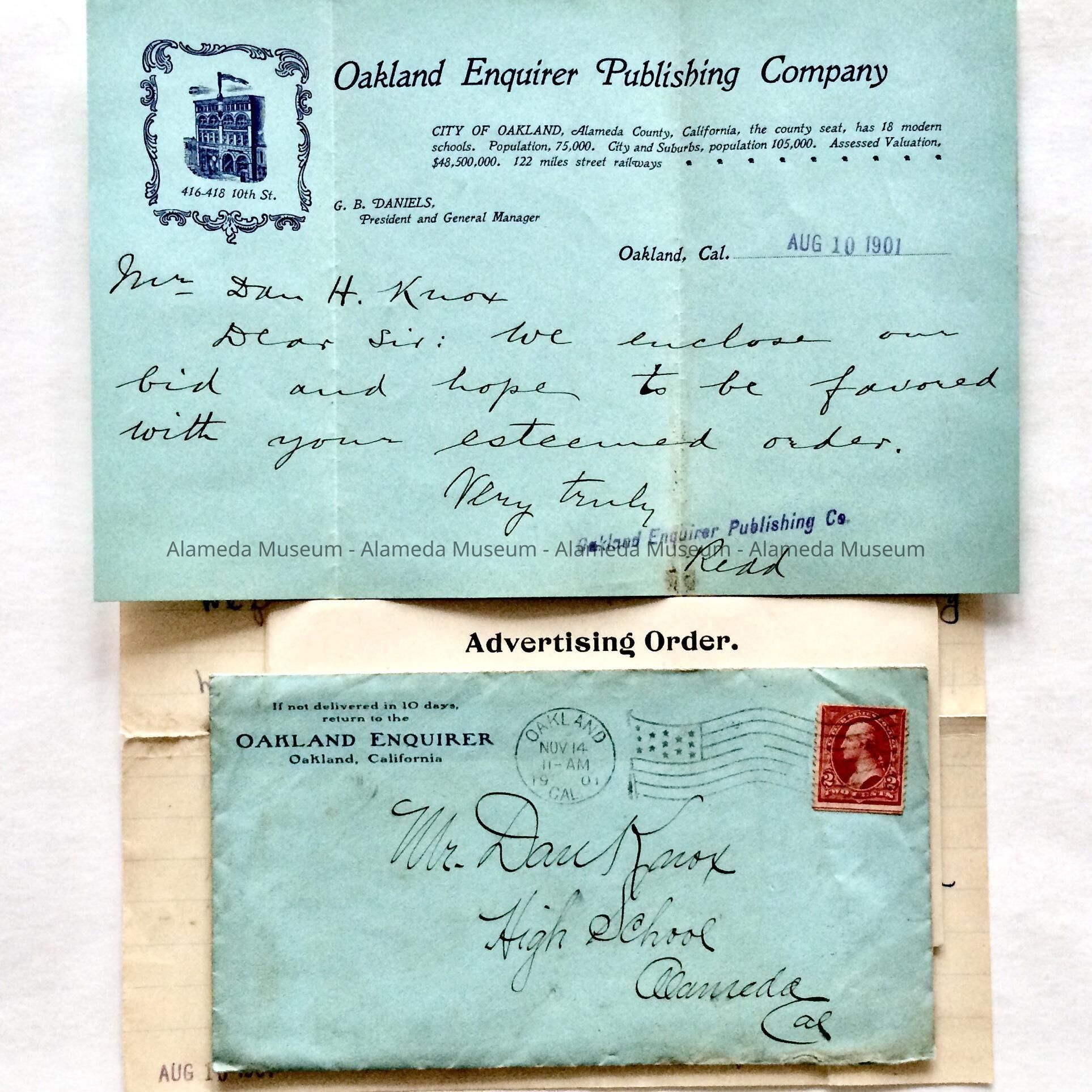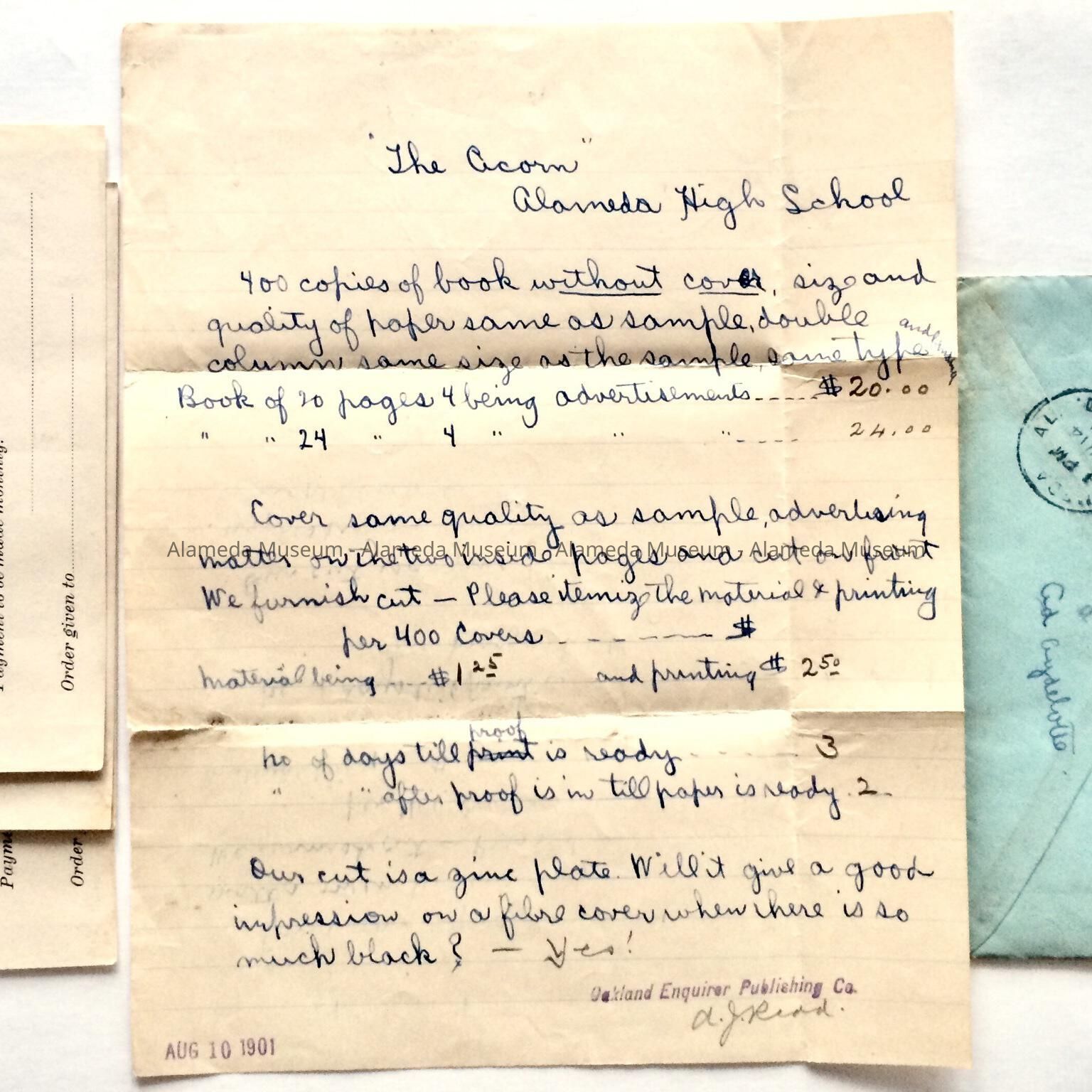 LETTER ADVERTISING ORDERS AND WRITTEN CORRESPONDENCE. BID ADDRESSED TO DANIEL KNOX, HIGH SCHOOL, FROM THE OAKLAND INQUIRER PUBLISHING COMPANY, FOR THEIR BID FOR PRINTING 400 COPIES OF "THE ACORN," FOR THE ALAMEDA HIGH SCHOOL YEARBOOK. ALSO INCLUDED ARE ENTRY BLANKS FOR ADVERTISEMENTS BY MERCHANTS IN "THE ACORN" YEARBOOK.