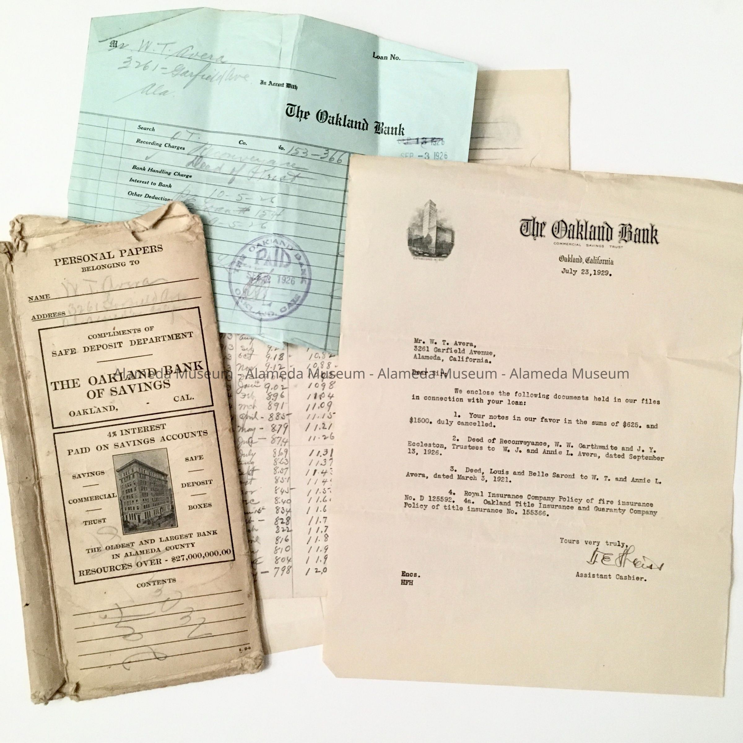 History of Object: papers relating to an account at the Oakland Bank of W.T. Avera of 3261 Garfield Ave. A is a receipt of recording charges for a Deed of Reconveyance; B. is a letter returning the handwritten notes (on the back of stationery of the Ohio Varnish Company, where W.T. Avera was employed) and other documents, to wit: Deed of Reconveyance of September 13, 1926 (87.17.14), Deed dated March 3, 1921 (87.17.13), Royal Insurance Company Policy of fire insurance No. D 125592 (not found in collection), and title insurance policy No. 155366 (87.17.15).