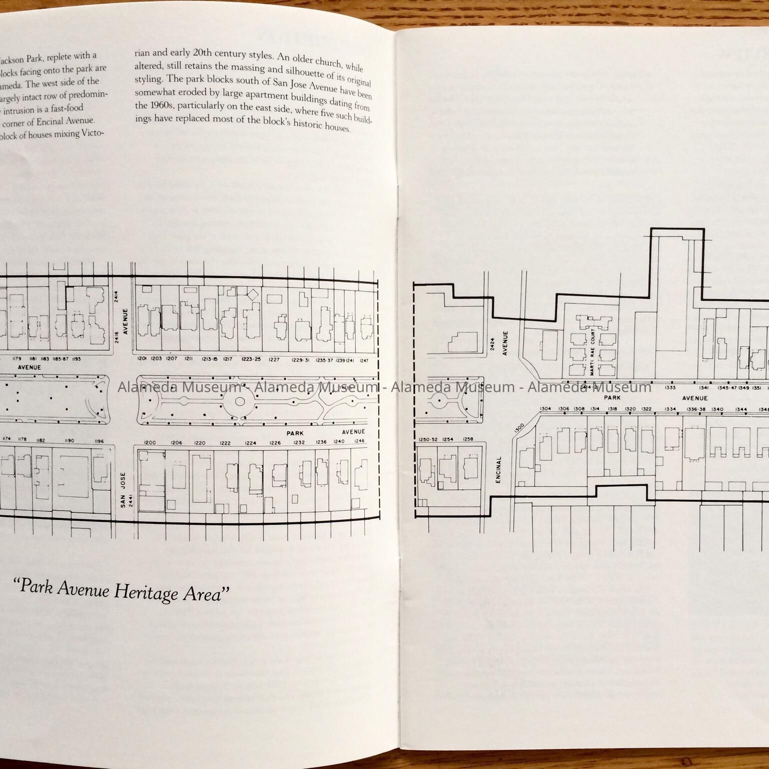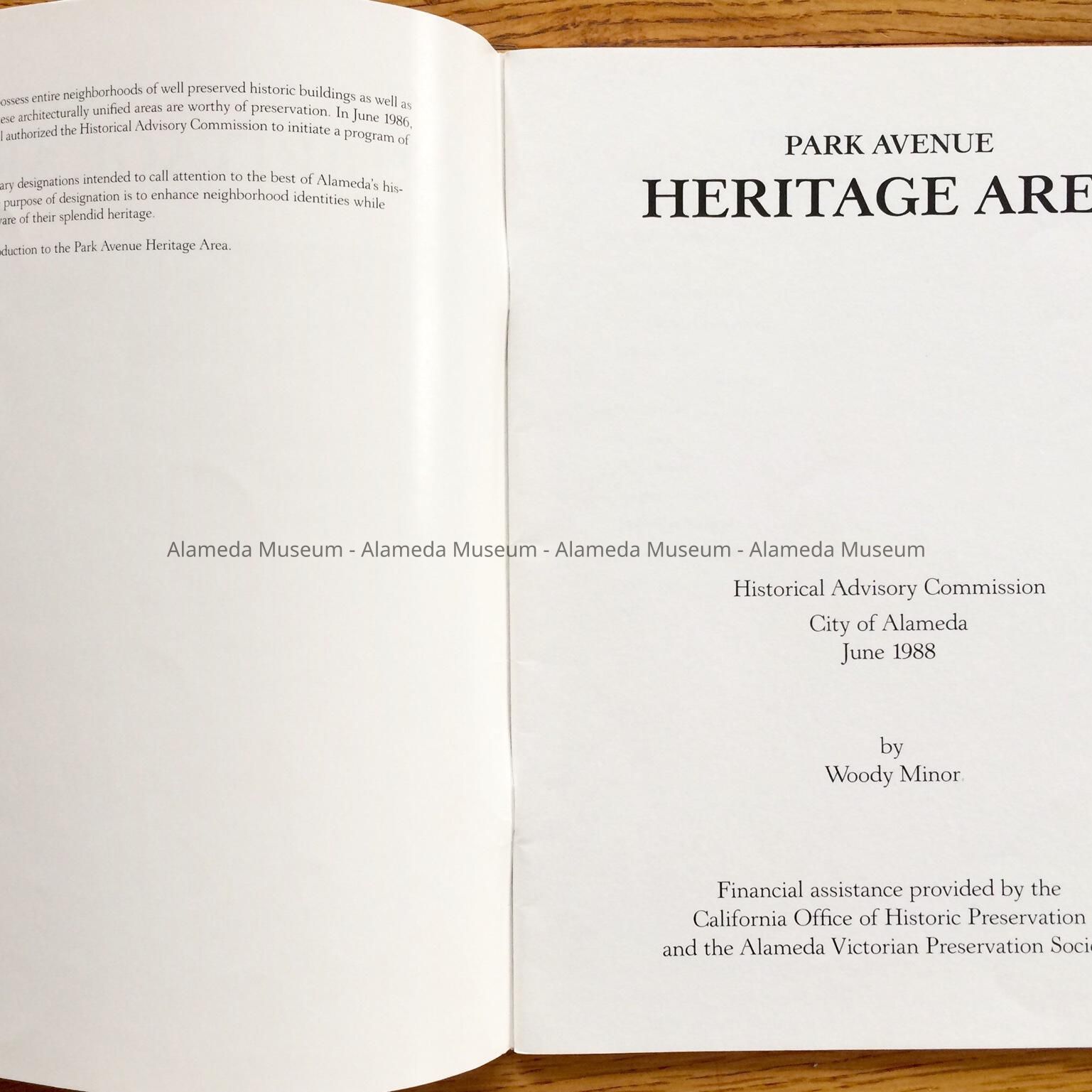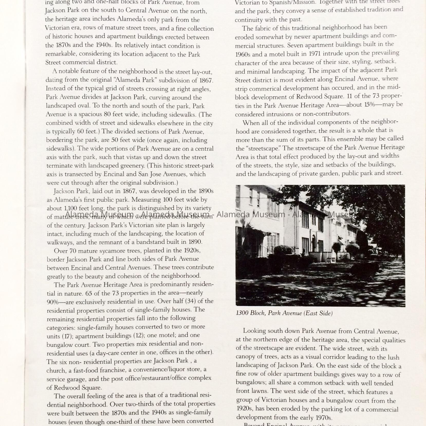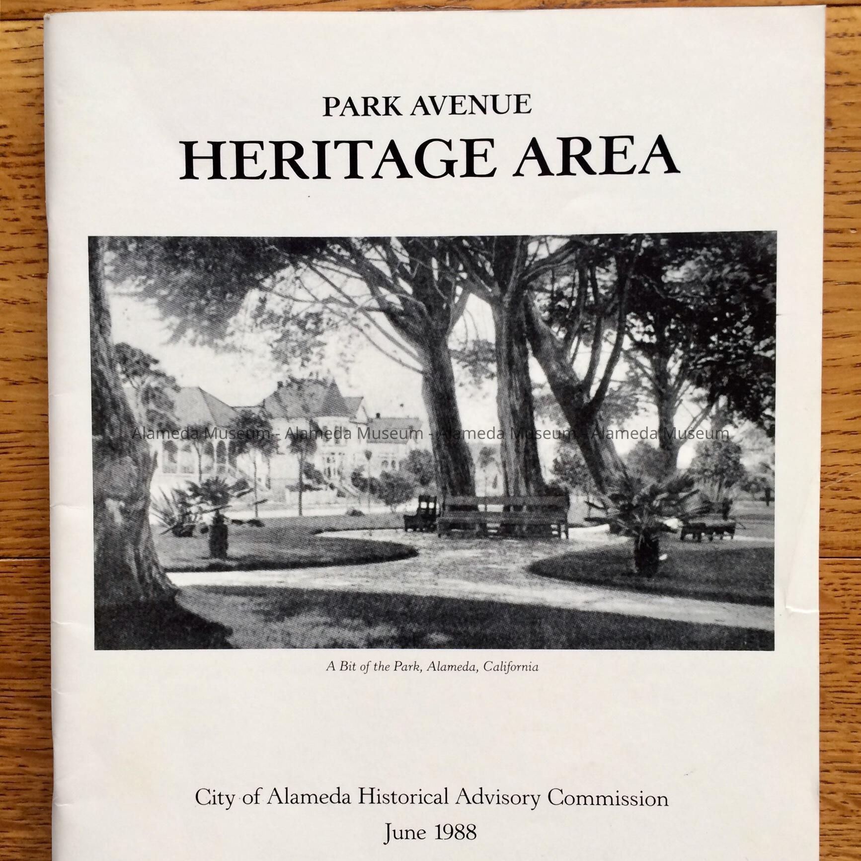Softbound booklet. Cover has black-and-white illustration and bold-printed caption, “Park Avenue Heritage Area”.