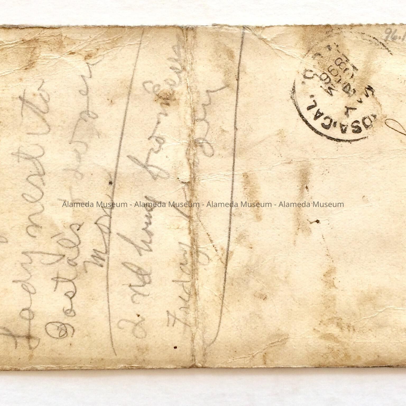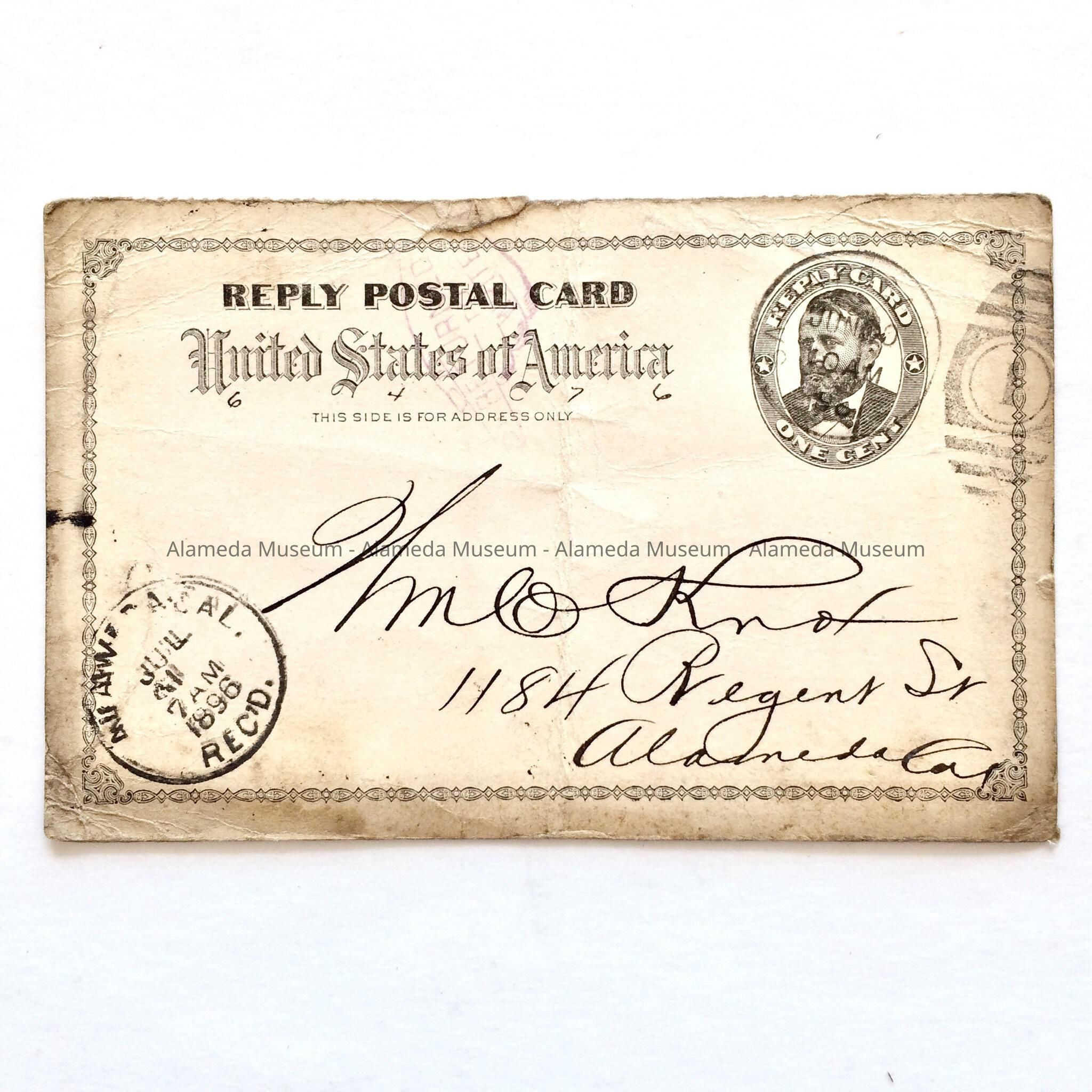 PART OF A POSTCARD THAT WAS ADDRESSED TO WILLIAM KNOX, 1184 REGENT STREET, ALAMEDA, CALIFORNIA, IN 1896.