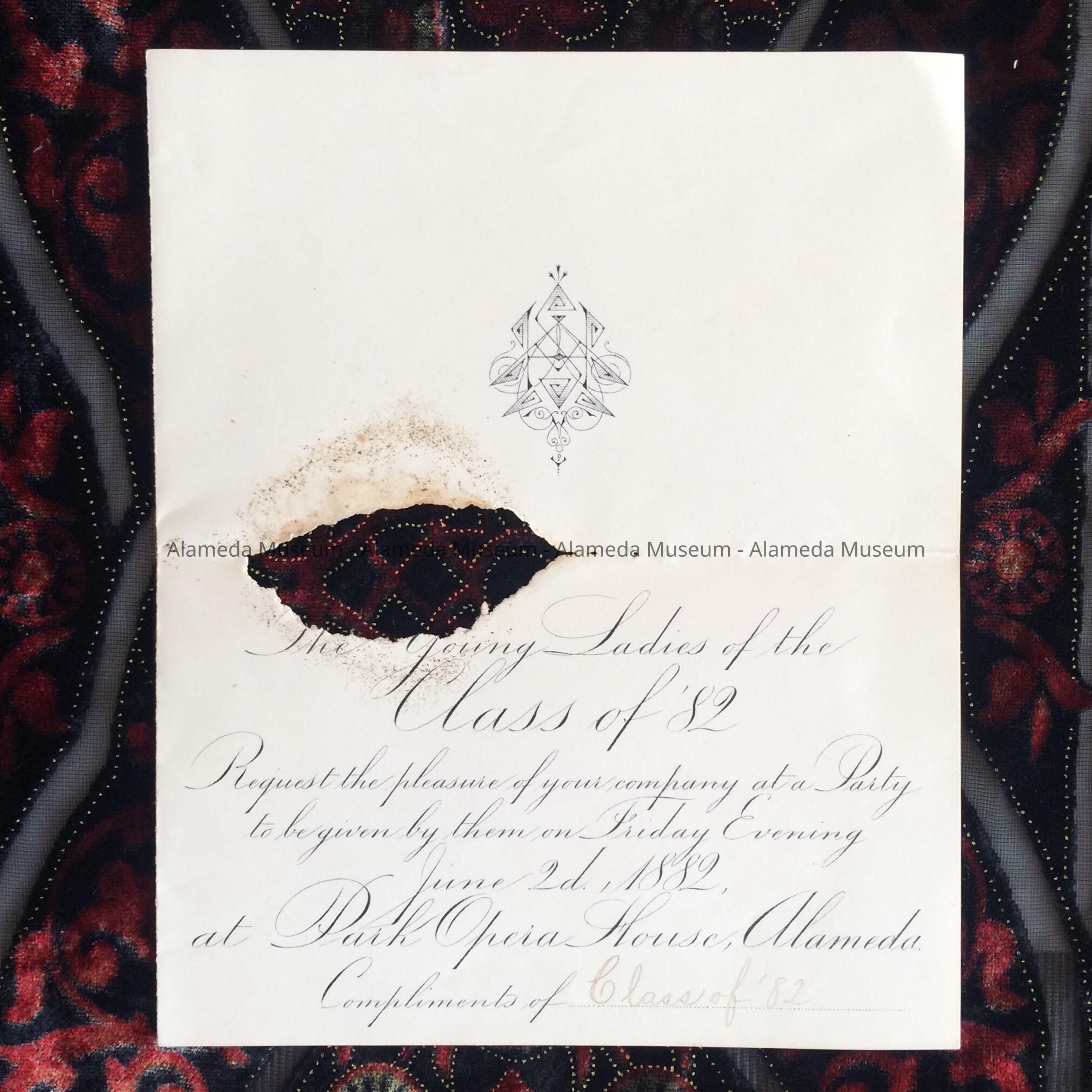 History of Object: Party invitation from the graduating class of the original Alameda High School (now known as Haight School), 1882. The event took place at the Park Opera House, June 2nd, 1882.