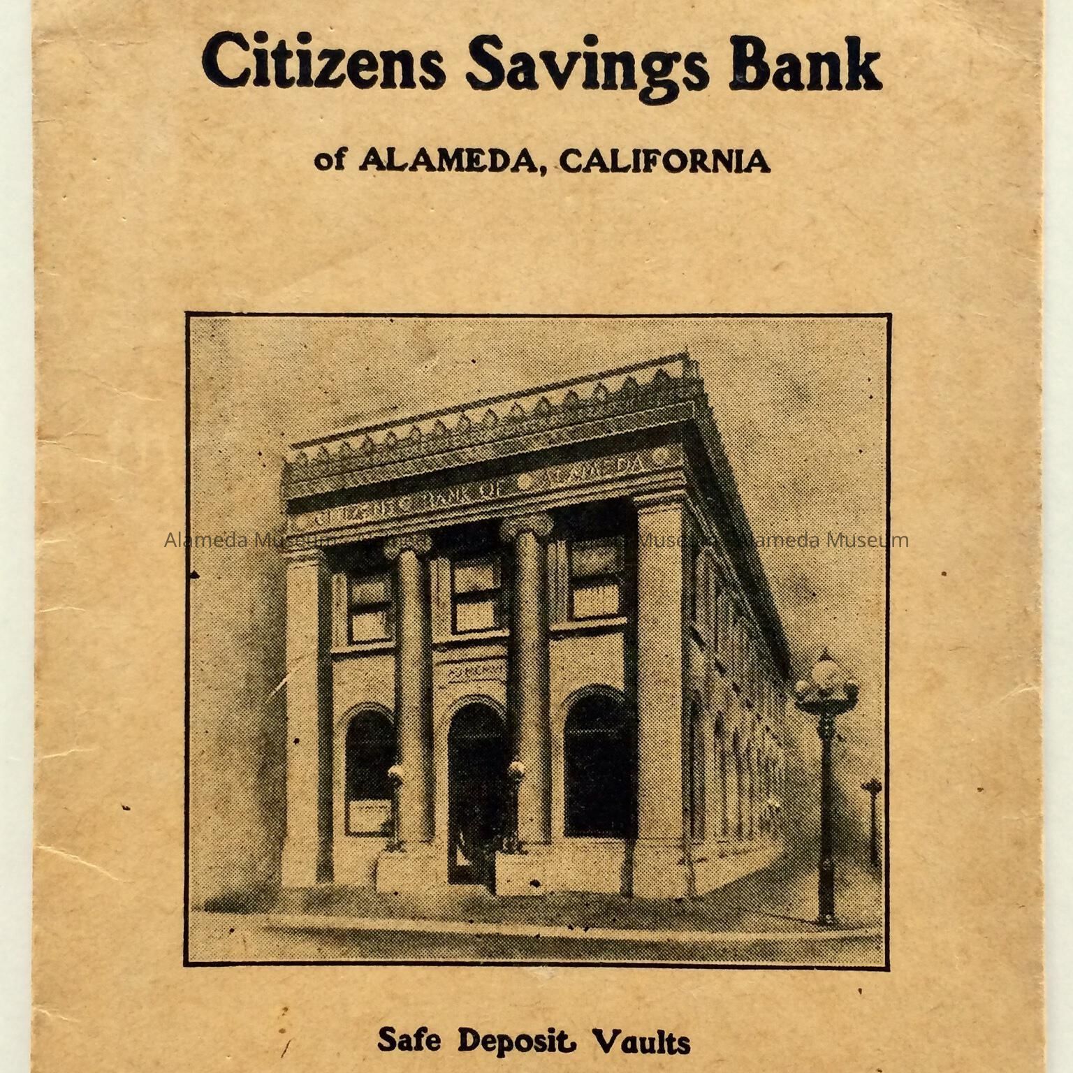 PASS BOOK ENVELOPE OF THE CITIZENS SAVINGS BANK, NOW BANK OF AMERICA, SANTA CLARA AVENUE AND PARK STREET, ALAMEDA. THE PASS BOOK ENVELOPE DEPICTS THE BANK BUILDING IN ITS ORIGINAL STATE.