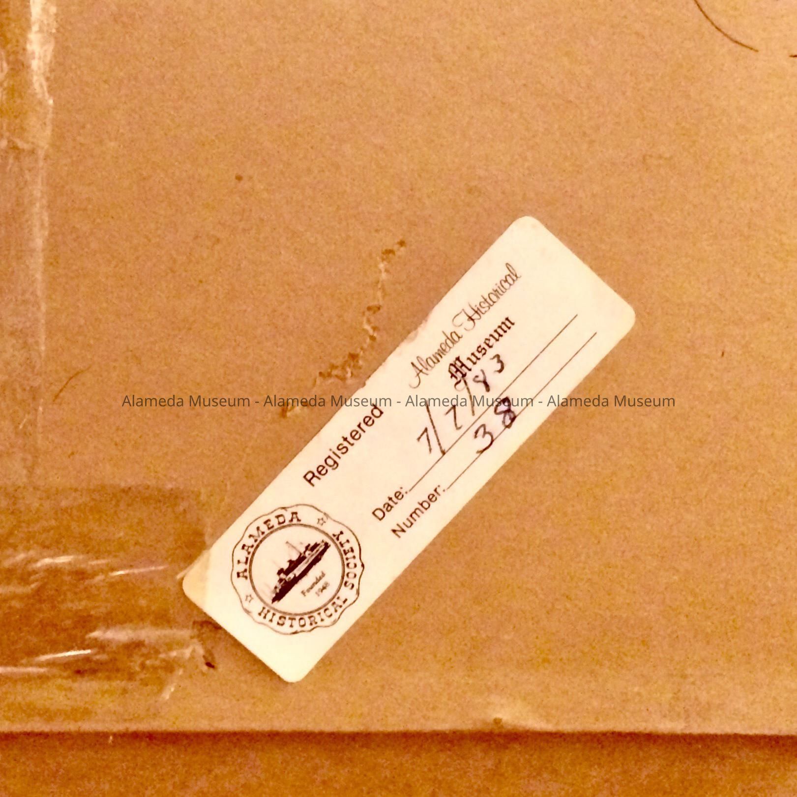 Paper backing has a sticky label from the Alameda Historical Society, 'Registered' 7/7/83, Number 38, and an envelope taped to it with an exhibit list, with number 38 underlined, '35X26 Artist's "Dream House", M/M Thomas Robertson'.