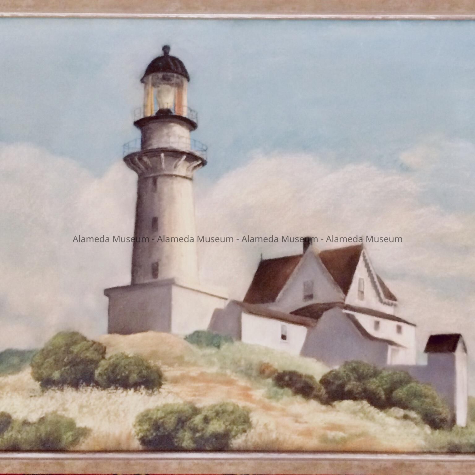 Description: A pastel painting under glass, but unframed. The subject is a lighthouse with caretaking outbuildings.