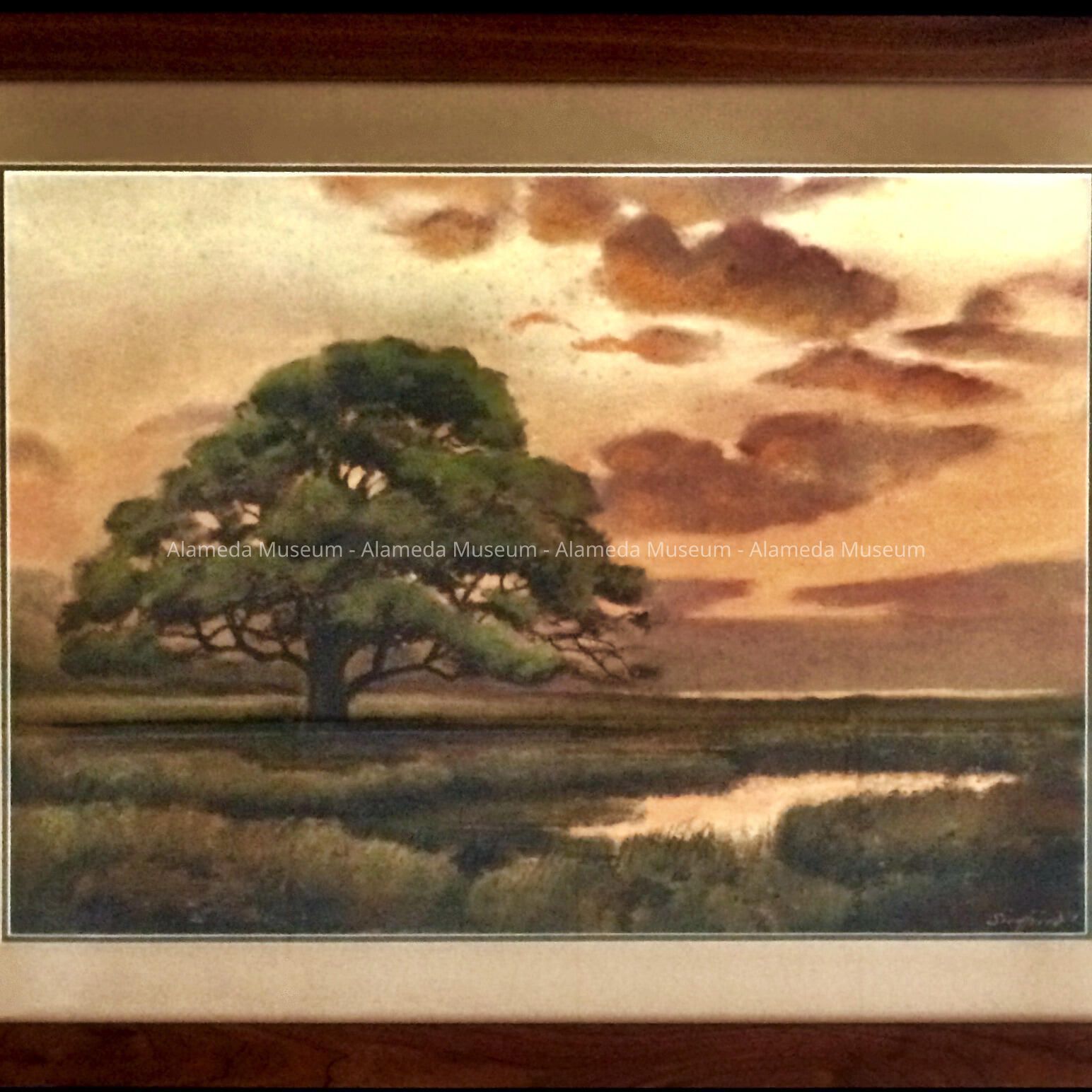 PASTEL PAINTING, DEPICTING OAK TREE AND SUNSET. THE PAINTING IS DOCUMENTED ON THE REVERSE WITH THE FOLLOWING MESSAGE: "OAK TREE NEAR THE MARSHES OF SAN FRANCISCO BAY, SAN MATEO, CALIFORNIA." AN ORIGINAL PASTEL PAINTING BY EDWIN SIEGFRIED, ALAMEDA, CALIFORNIA, AUGUST 1944. THE SIEGFRIED PAINTING WAS IN THE ART COLLECTION OF EDWIN AND LUCY ARRIOLA, PARENTS OF THE DONOR.
