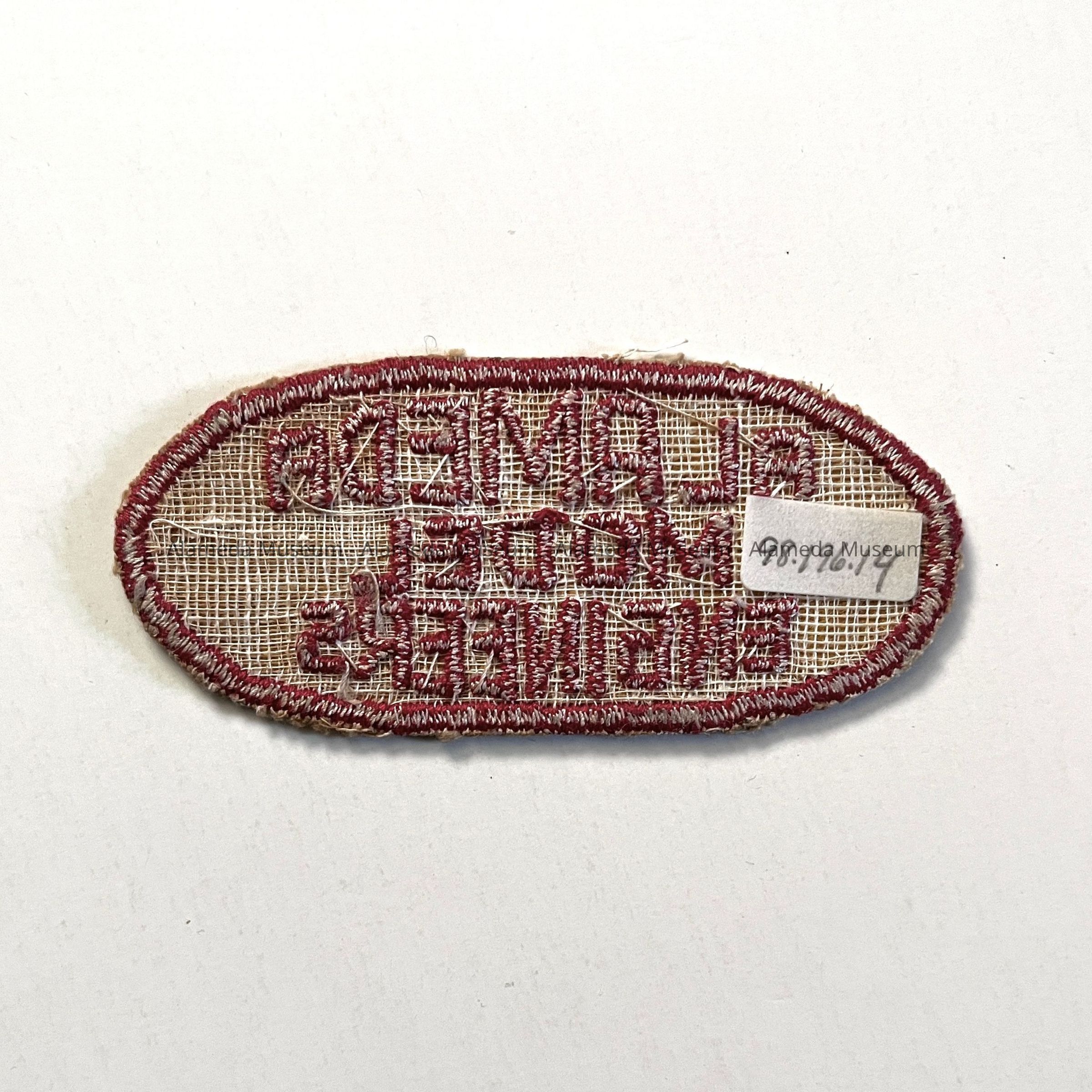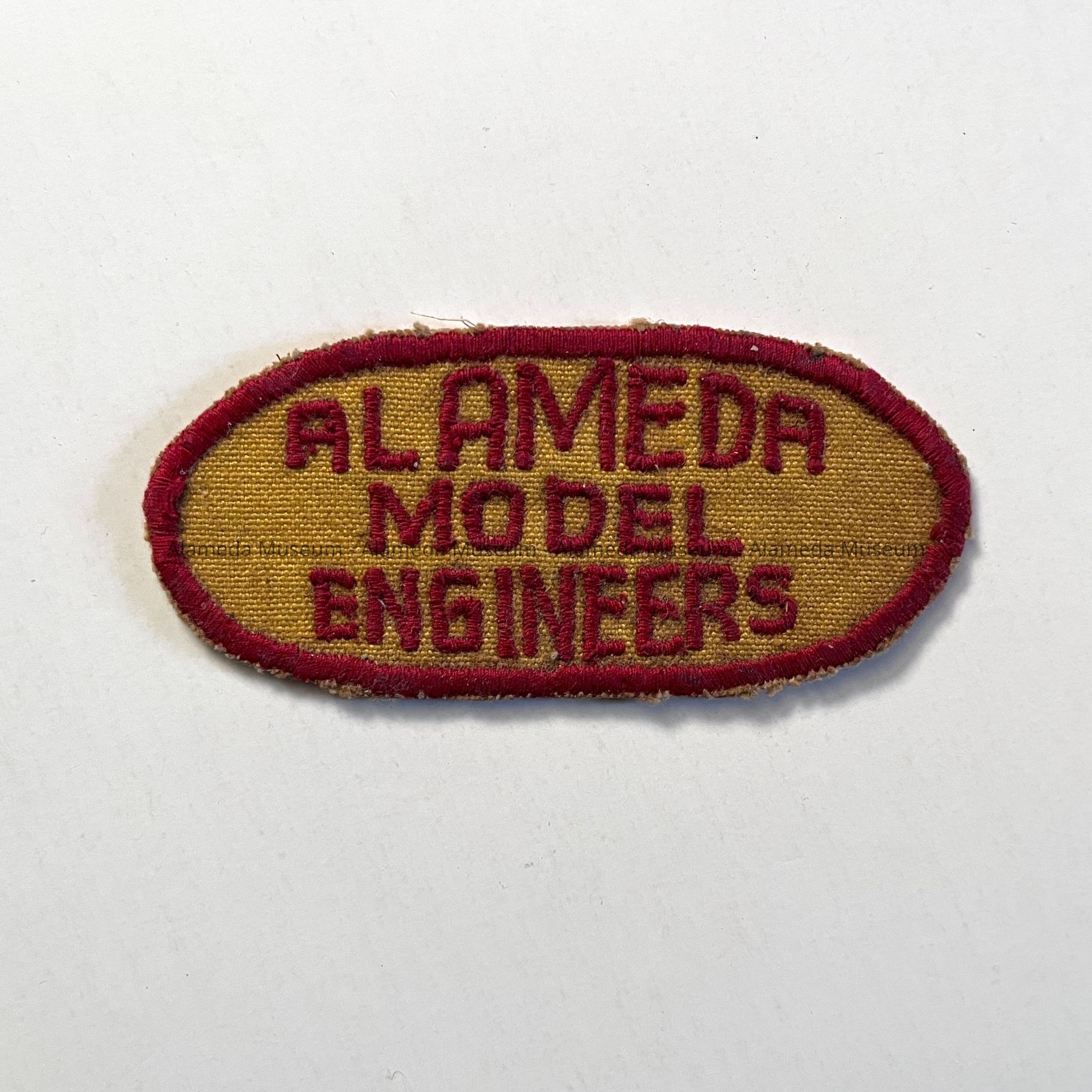 MACHINE-EMBROIDERED, OVAL-SHAPED LABEL (OR PATCH). EMBROIDERY IN RED-COLORED SILK THREAD ON A GOLD COLORED LINEN BACKGROUND. CAPTION STATES, "ALAMEDA MODEL ENGINEERS."