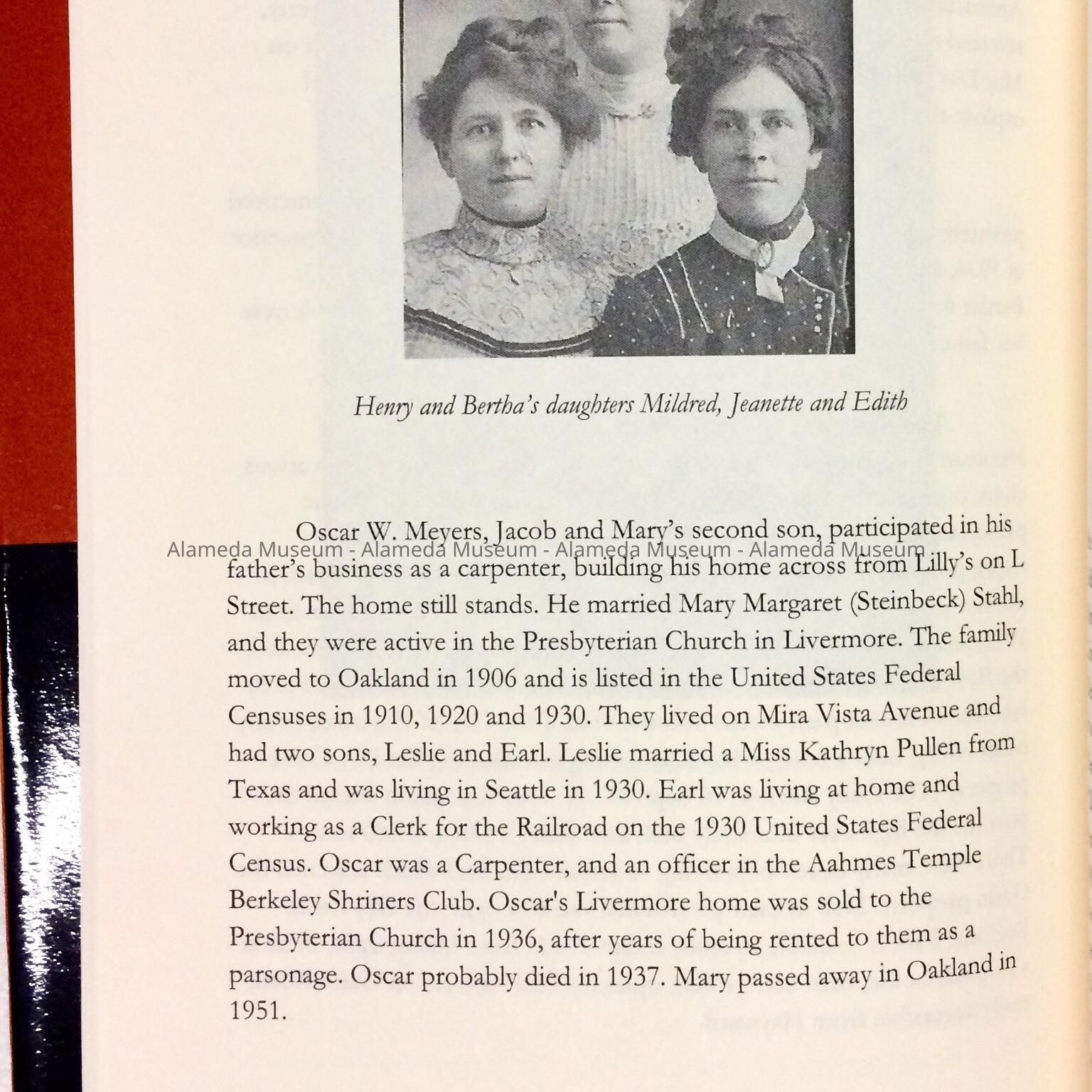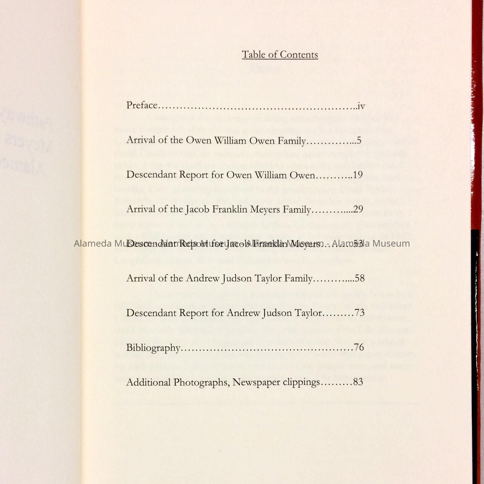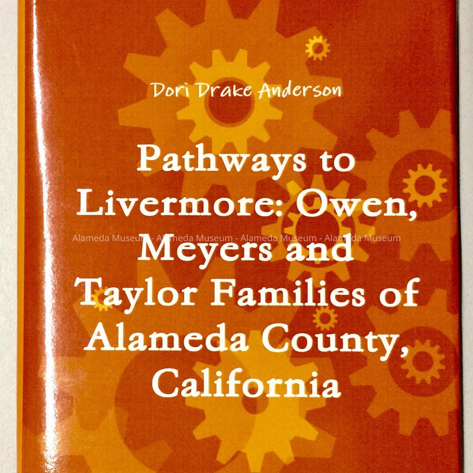 DESCRIPTION: A HARDBOUND BOOK WITH PAPER JACKET THAT HAS THE CAPTION, "PATHWAYS TO LIVERMORE, OWEN MEYERS AND TAYLOR FAMILIES OF ALAMEDA COUNTY, CALIFORNIA." COVER IS IN ORANGE COLORED PATTERNED BACKGROUND.