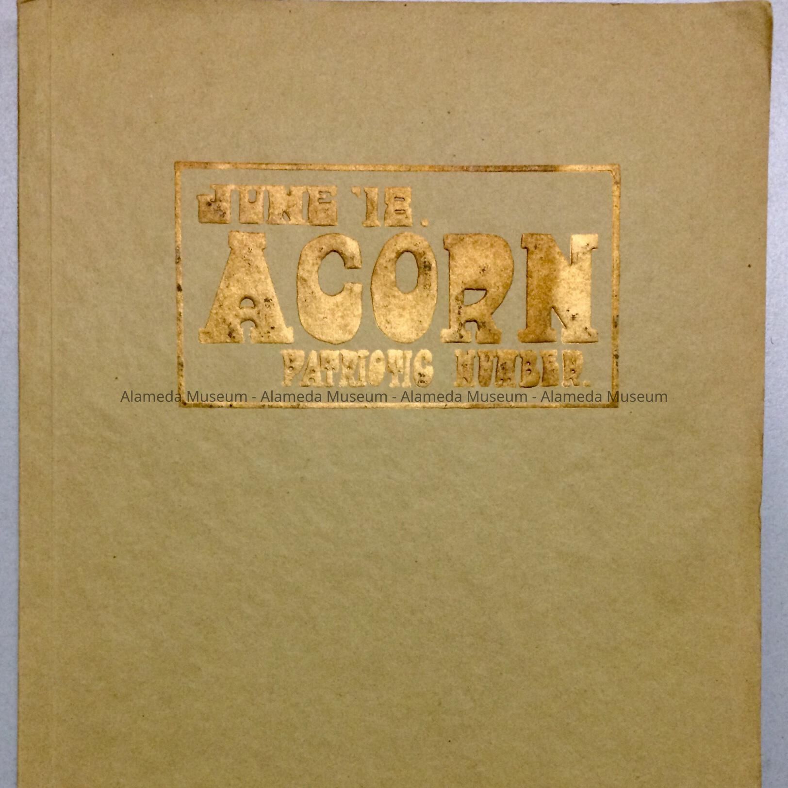 Description: A softbound year book with a cover of heavy stock paper. It has an embossed caption, "June '18 Acorn Patriotic Number" in gold colored type on a light gold colored background.