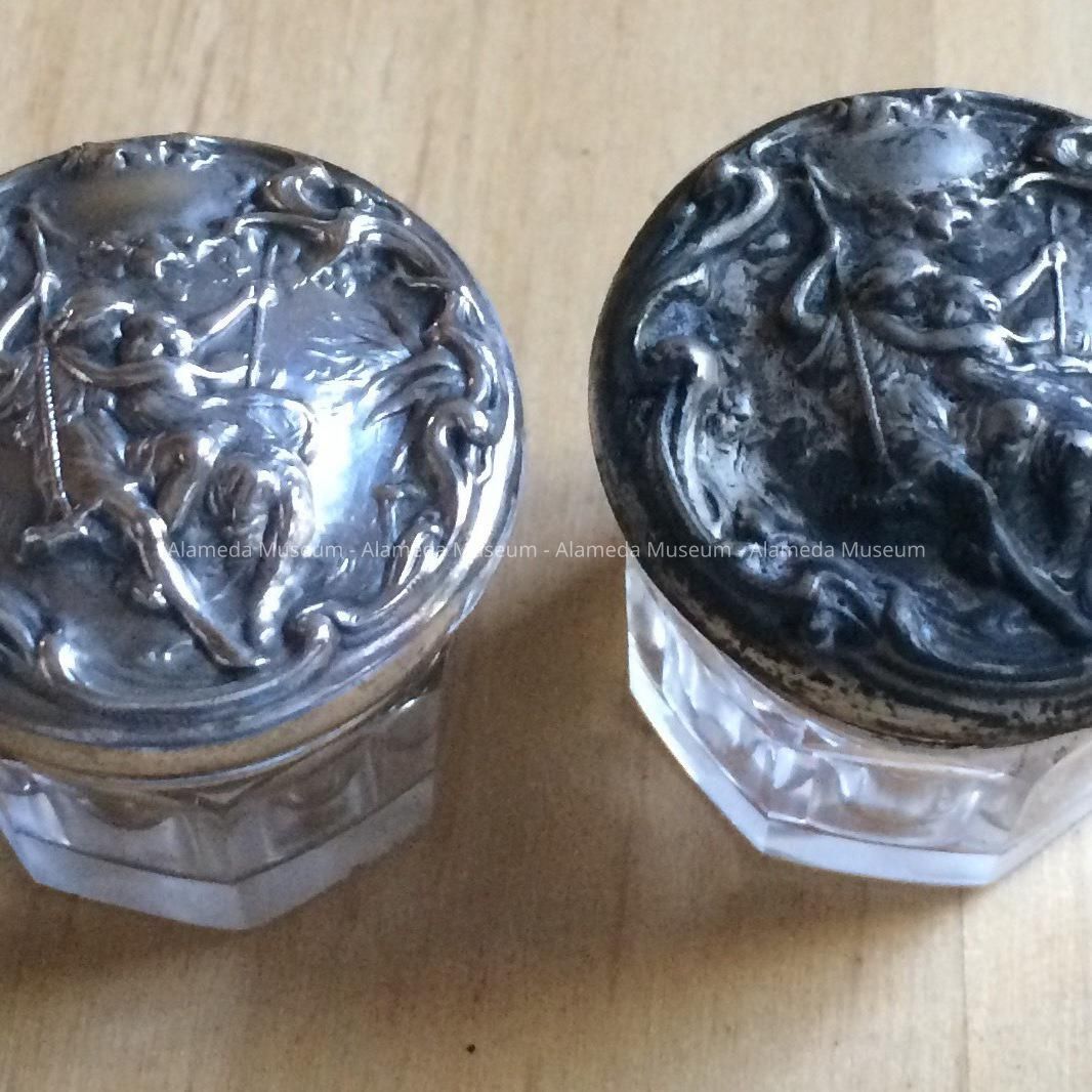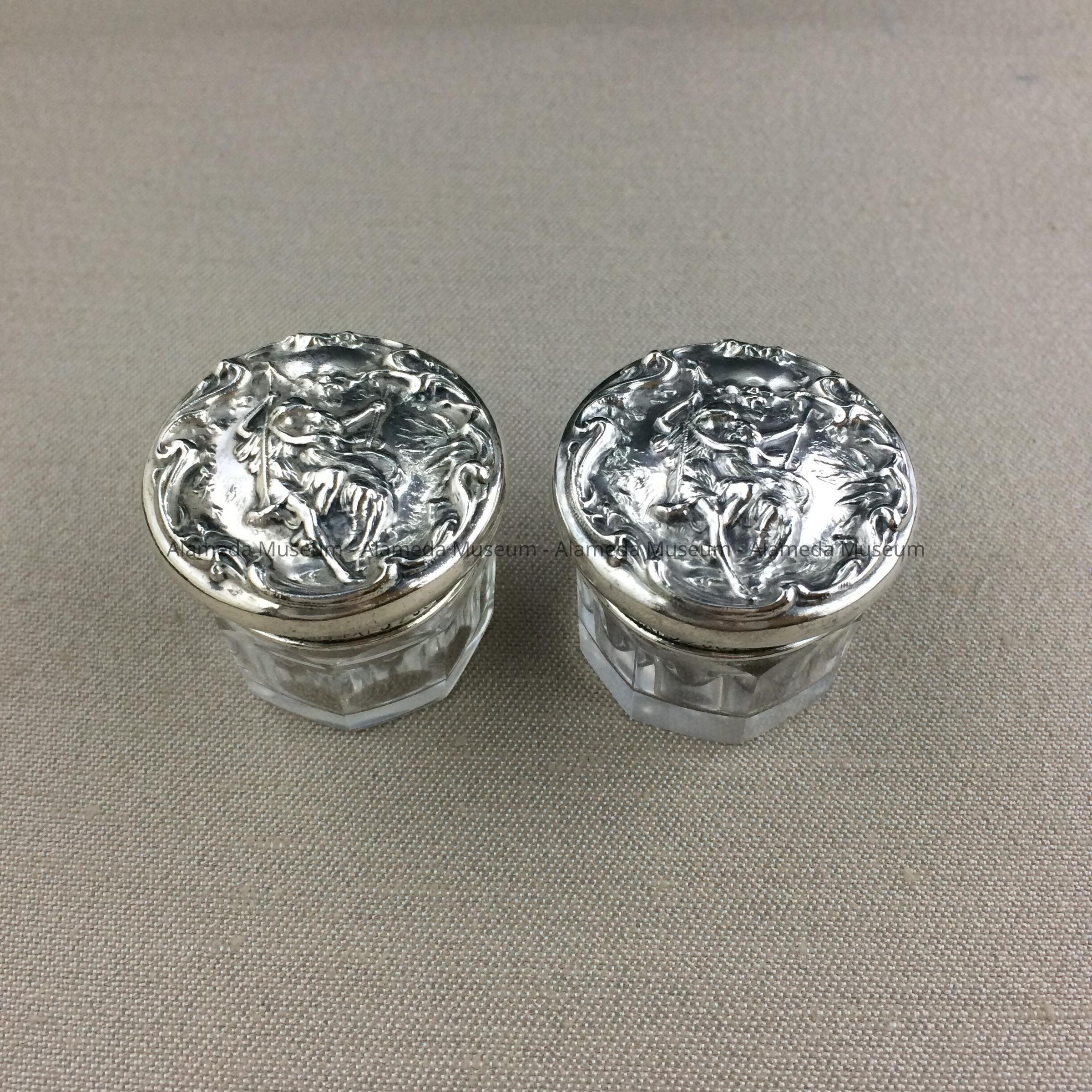 Description: Two small powder jars, with jar in uncut blown octagonal clear glass, with round neck, and sterling silver lid with art nouveau pattern featuring an embracing couple seated precariously on a swing. On the rim of the silver: F & B Sterling Pat'd 2067. Lids may originally have had a gilt wash, as the undersides have a golden sheen.