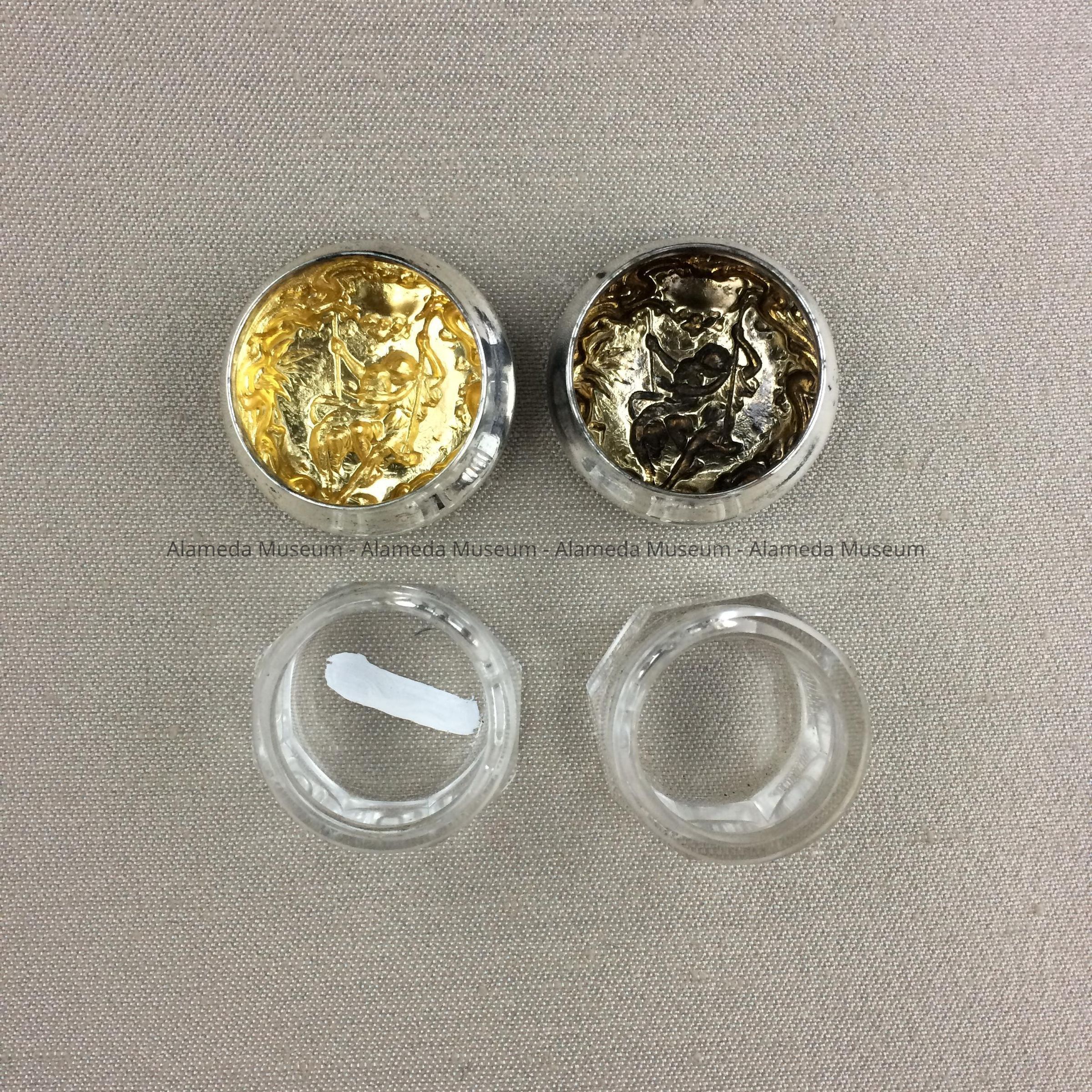 Lids were badly oxidized with black tarnish, obscuring the pattern, and were polished by a museum volunteer at this time.