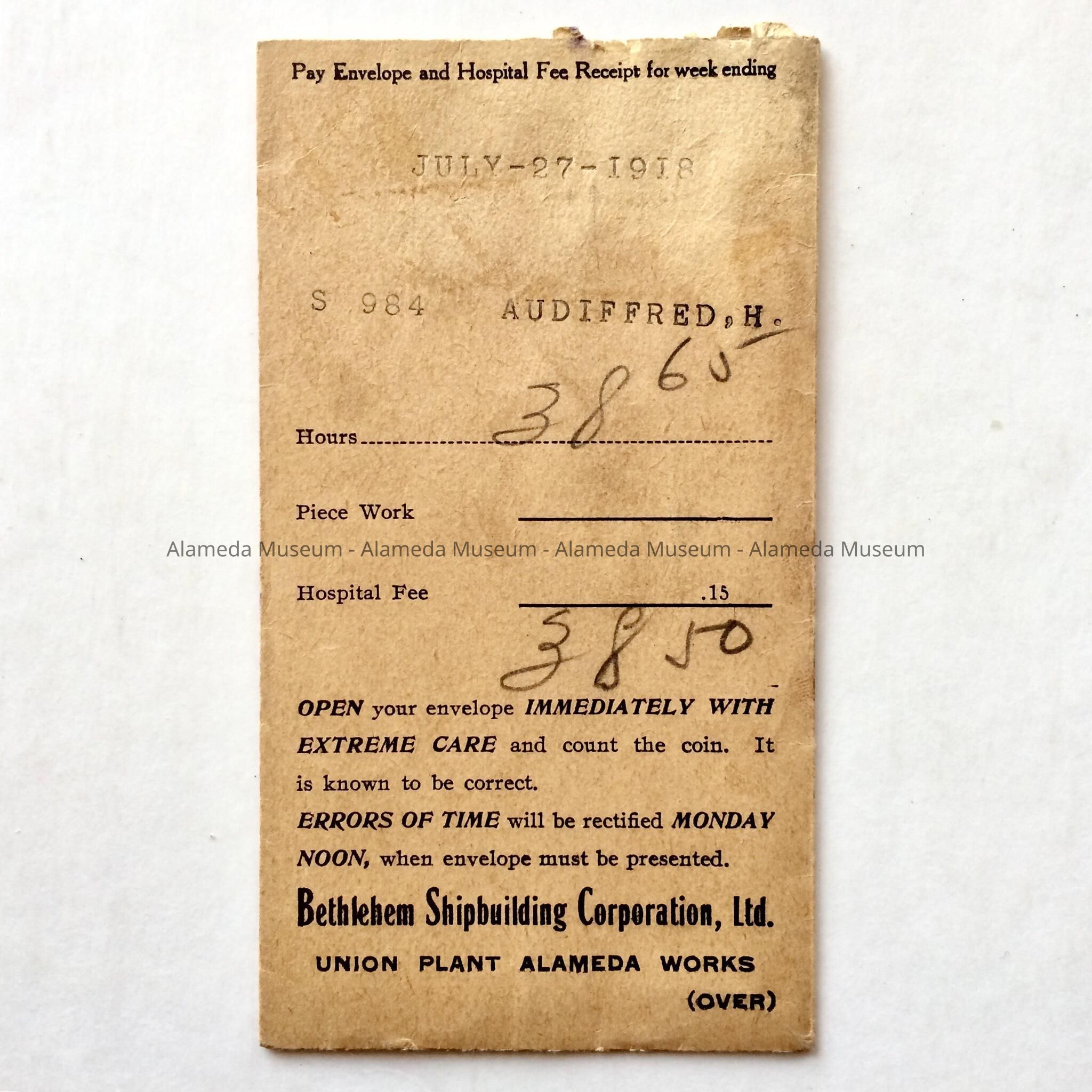 PAY ENVELOPE OF THE BETHLEHEM SHIPBUILDING CORPORATION, UNION PLANT ALAMEDA WORKS, FOR 1918. NAME OF EMPLOYEE, A. AUDIFFRED AMOUNT, $38.65 DATED, JULY 27, 1918