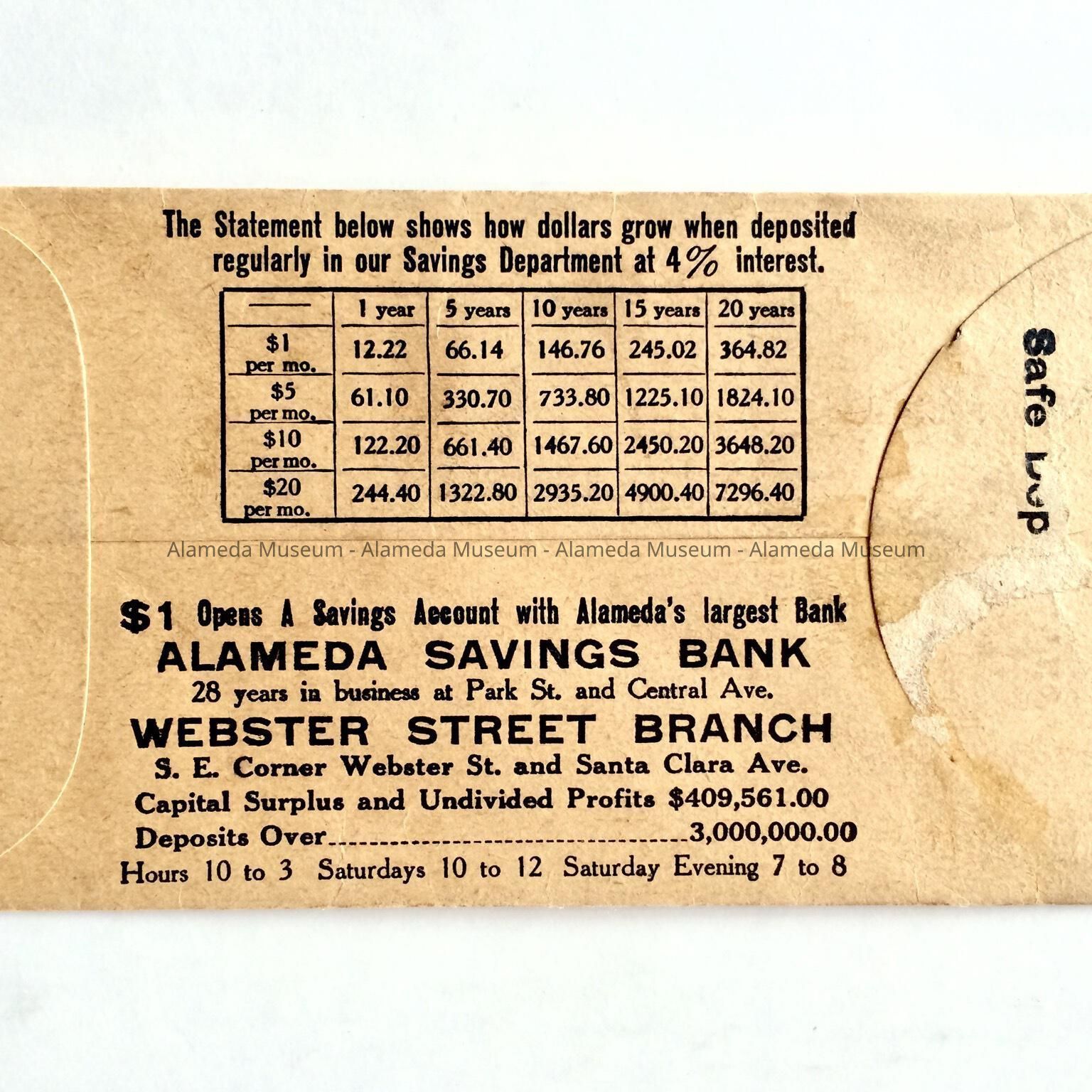 DESCRIPTION: OBLONG ENVELOPE, OPENING AT NARROW END. HAS PRINTING ON BOTH SIDES, WITH BLANKS FOR ENTERING INFORMATION ON THE REVERSE SIDE, ADVERTISEMENT FOR THE ALAMEDA SAVINGS AND WEBSTER STREET BRANCH BANKS.
