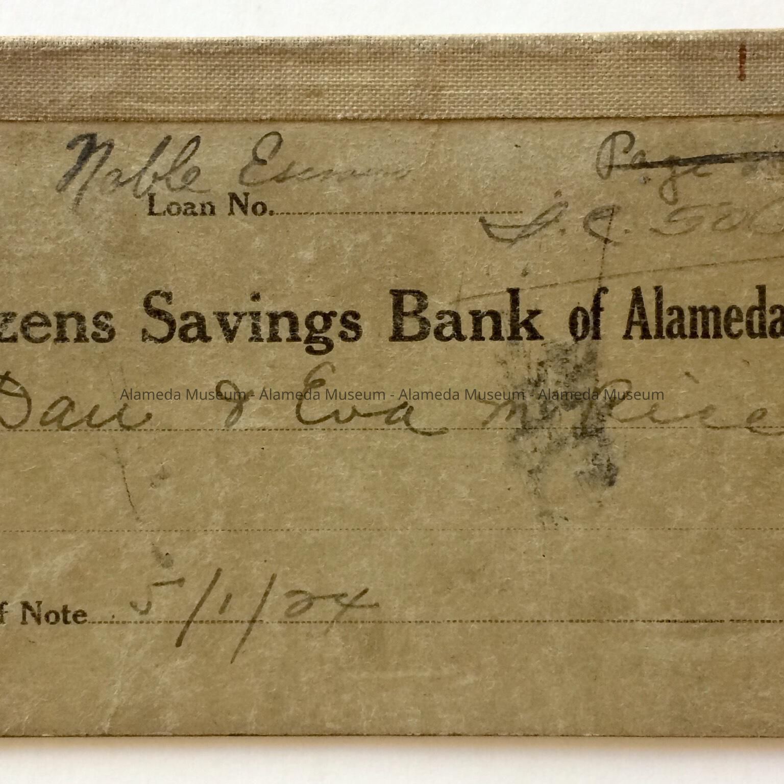 Description: Payment book with cover of heavy stock, bold caption "Citizens Savings Bank of Alameda." Inscribed in ink "Dan & Eva M. Rice."